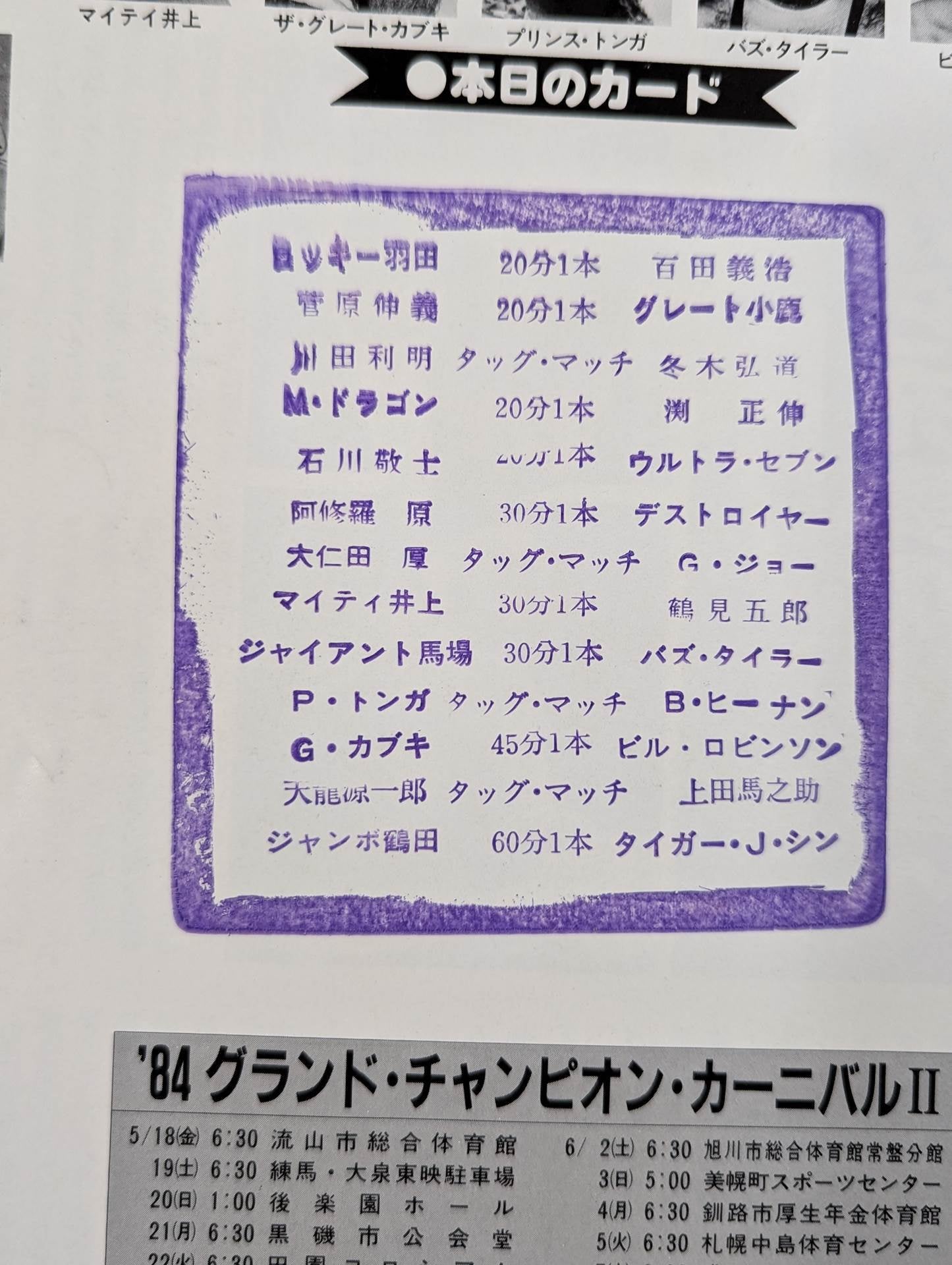 Venue: Korakuen Hall / stamped with list of matches :[ International Tag Team Championship Match] Jumbo Tsuruta &Tenryu Genichiro vs Tiger Jeet Singh & Umanosuke Ueda / Prince Tonga & The Great Kabuki vs. Bill Robinson & Bobby Heenan