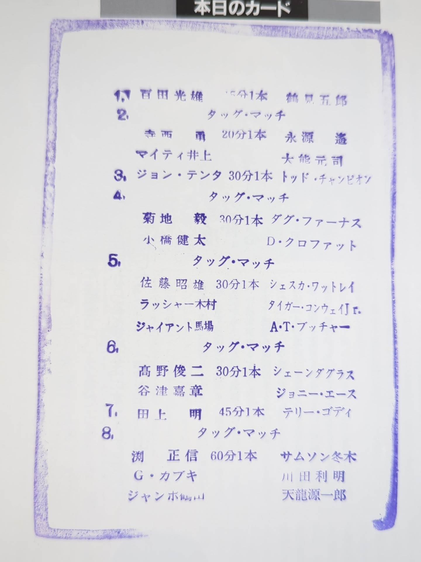 Venue: Kanagawa / Nichii Ebina Ice Skating Rink / stamped with list of matches : Jumbo Tsuruta & The Great Kabuki & Masanobu Fuchi vs Tenryu Genichiro & Toshiaki Kawada & Samson Fuyuki / Akira Taue vs Terry Gordy