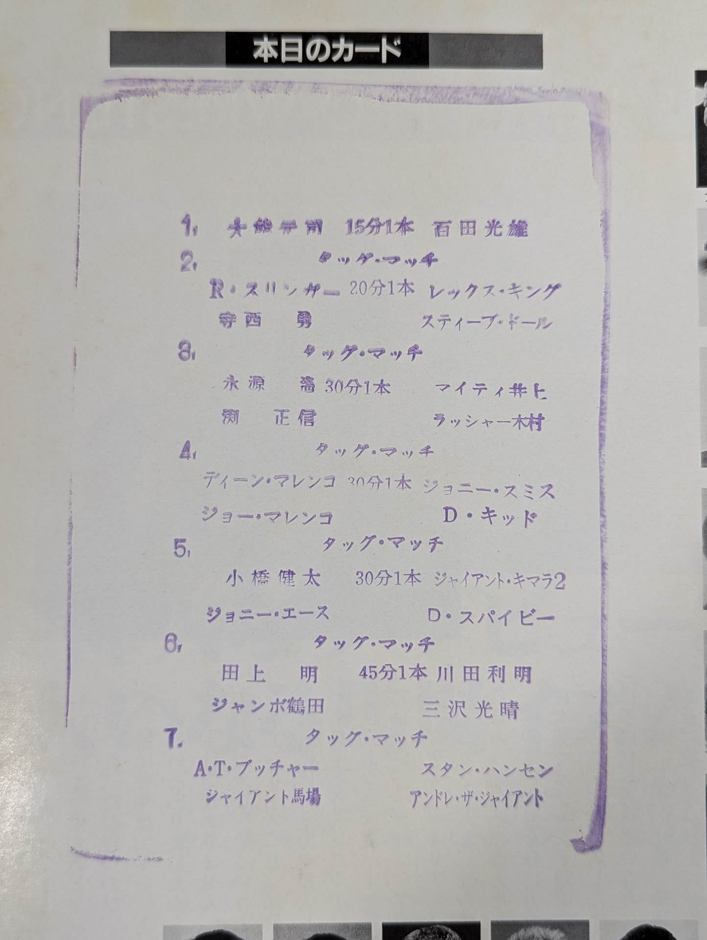Venue: Korakuen Hall / stamped with list of matches : Abdullah the Butcher & Giant Baba vs Stan Hansen & Andre the Giant / Jumbo Tsuruta & Akira Taue vs Toshiaki Kawada & Mitsuharu Misawa