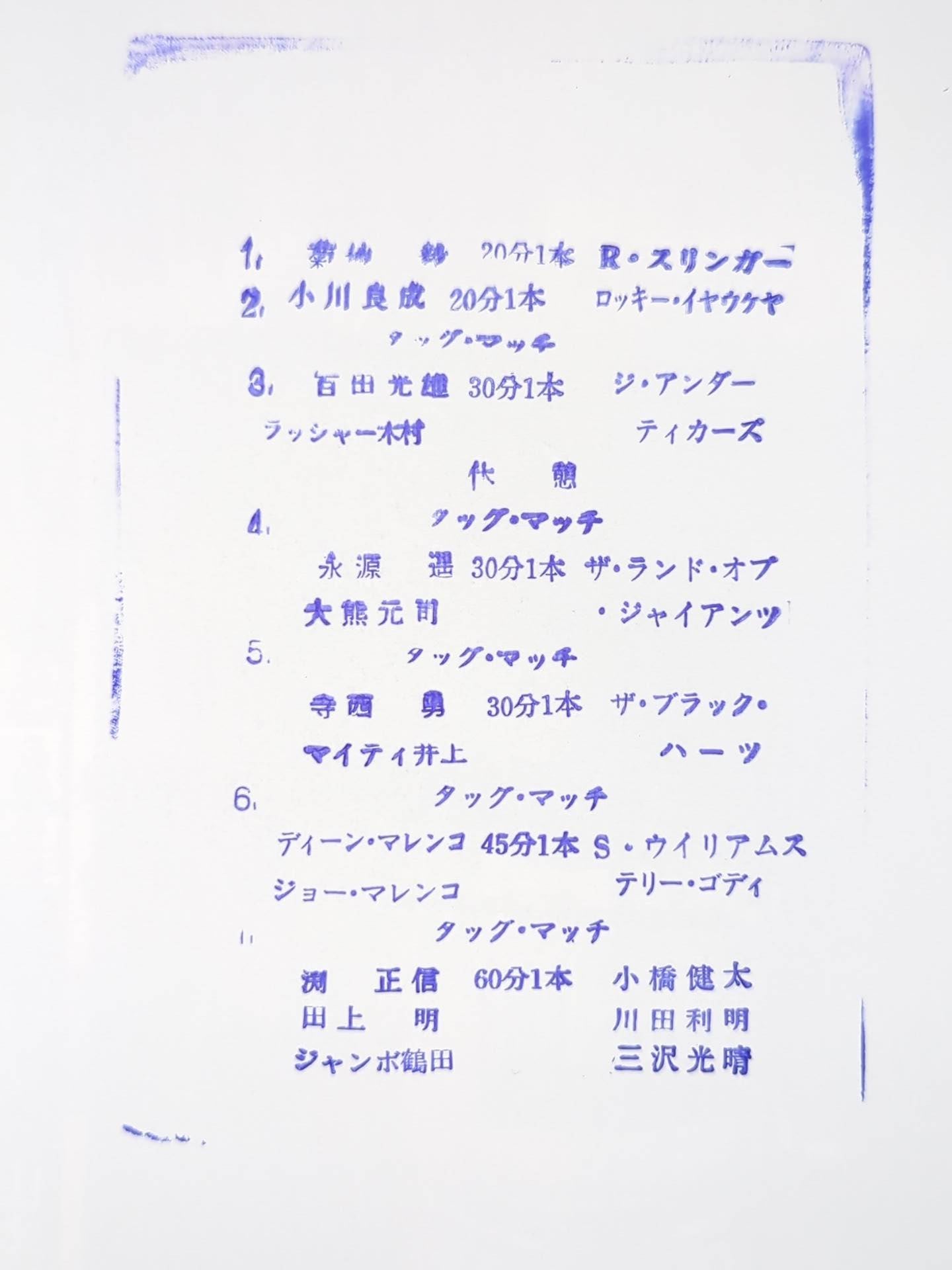 Venue: Korakuen Hall / stamped with list of matches : Jumbo Tsuruta & Akira Taue &Masanobu Fuchi vs Mitsuharu Misawa & Toshiaki Kawada & kenta Kobashi / Dean Malenko &Joe Malenko vs Steve Williams & Terry Gordy
