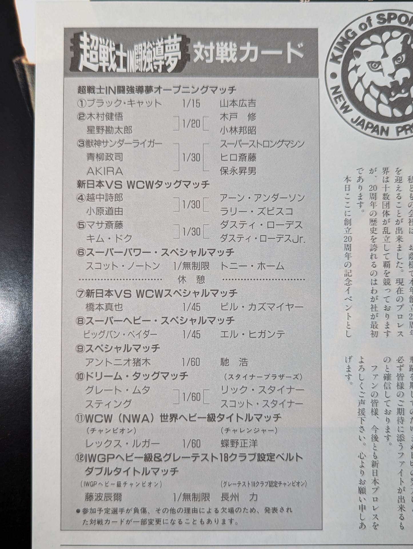 Venue: Tokyo Dome / list of the matches is printed : [IWGP Heavyweight & Greatest 18 Club Certified Belt fighters Match] Tatsumi Fujinami vs Riki Choshu /[WCW (NWA) World Heavyweight Fighters Championship] Lex Luger vs Masahiro Chono / Great Muta & Sting vs Rick Steiner & Scott Steiner / Antonio Inoki vs Hiroshi Hase / Vader vs El Gigante