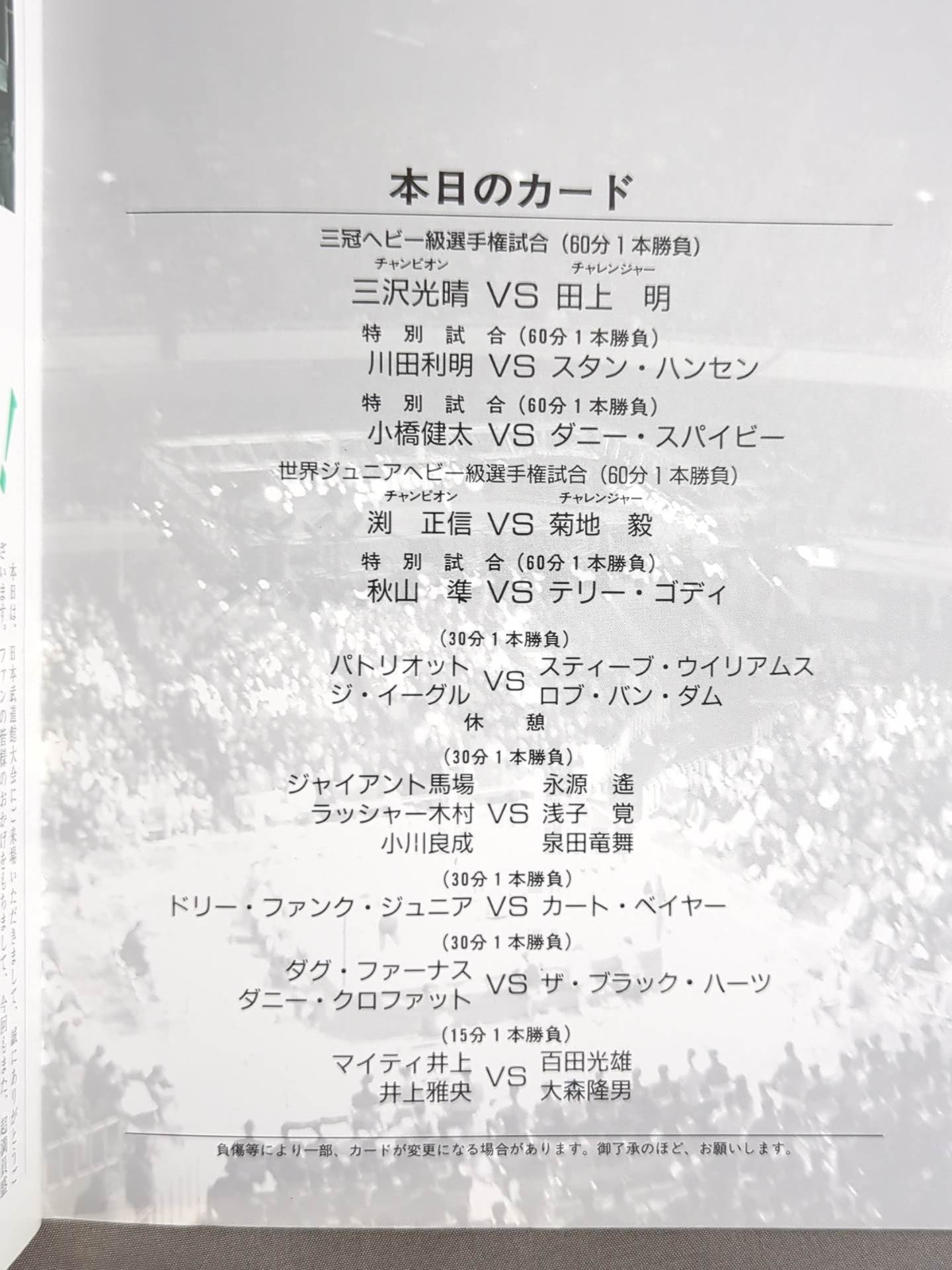 Venue: Nippon Budokan / list of the matches is printed : [Triple Crown Heavyweight fighters Match] Mitsuharu Misawa vs Akira Taue * Defense of Misawa / Toshiaki Kawada vs Stan Hansen
