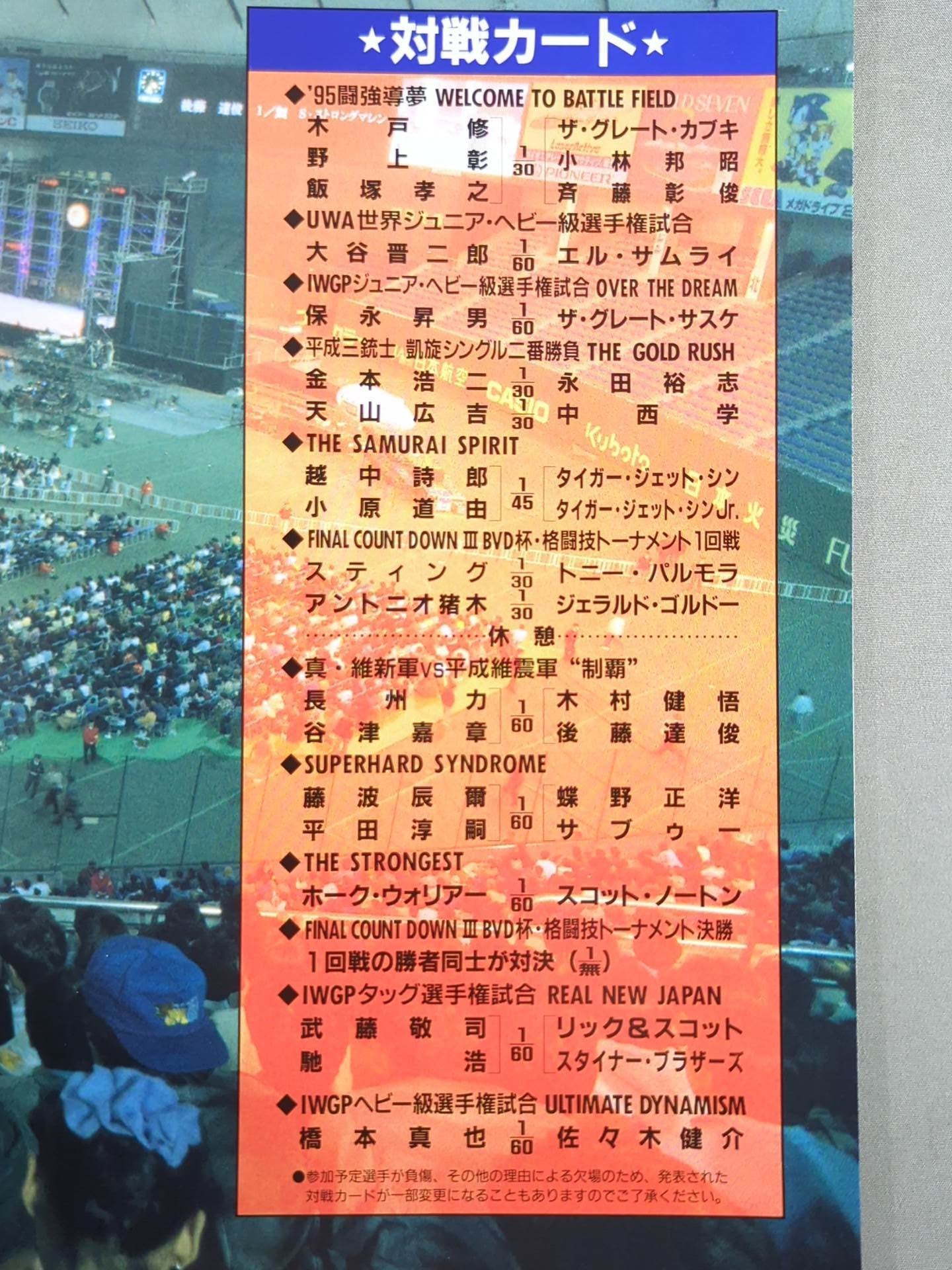 Venue: Tokyo Dome / list of the matches is printed : [IWGP Heavyweight fighters Tournament] Shinya Hashimoto vs Kensuke Sasaki /[IWGP Tag fighters Championship Match] Muto Keiji &Hiroshi Hase vs Steiner Brothers (Rick & Scott)