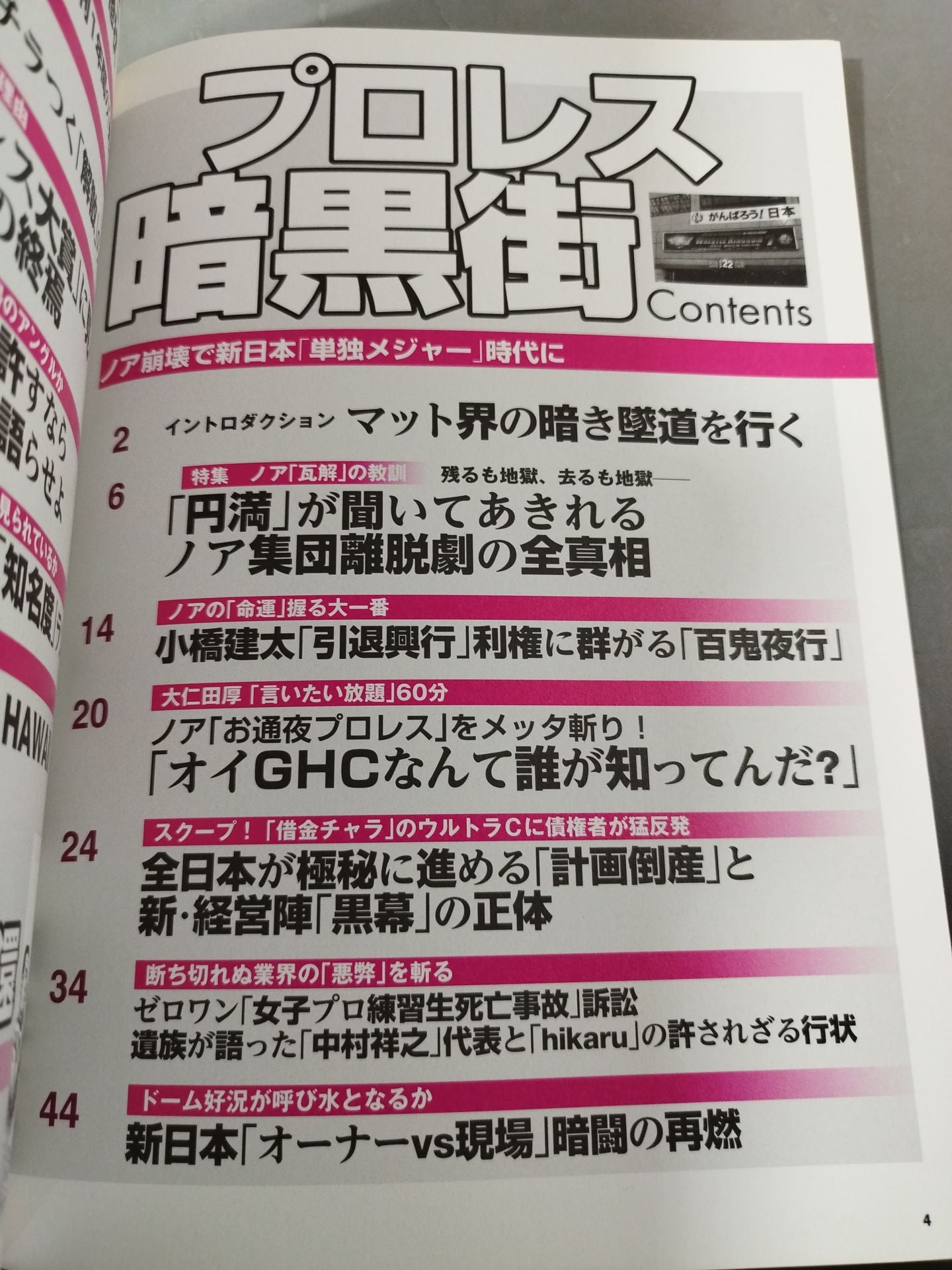 Noah's tense contract renewal as the internal collapse progresses. The popular Bushiroad New Japan Pro Wrestling Dome tournament. pro wrestler "Awareness Survey" shocking data. The identity of the "planned bankruptcy" and the mastermind secretly promoted by All Japan Pro Wrestling. Zero One's "female professional trainee death accident" bereaved family talks about the darkness of the industry. Hisahito Harada's dramatic drawings are full of content, such as Tarzan Yamamoto's "Return of the Prodigal Son".