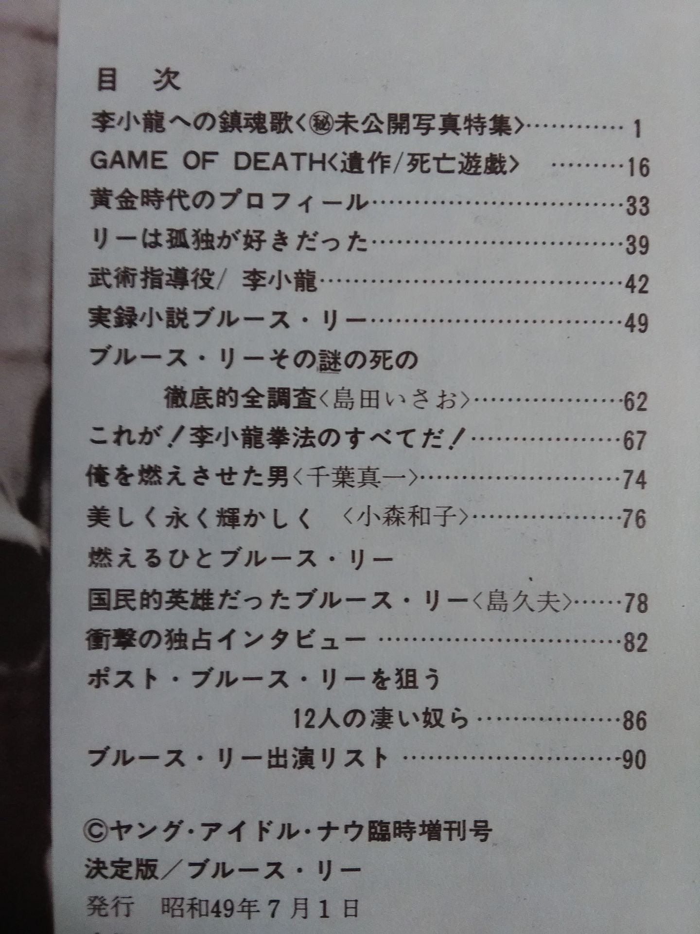 1974 Magazine Kavensha 5 Major Feature: ★ Three years after Bruce Lee 's death, a posthumous oversized issue! !! (1) Japan Unreleased photo feature (2) Famous scenes from the starring movie (3) True crime novel "Bruce Lee " (4) Thorough investigation of Bruce Lee's mysterious death (5) Bruce LeeAll about Kempo (with photo and commentary)