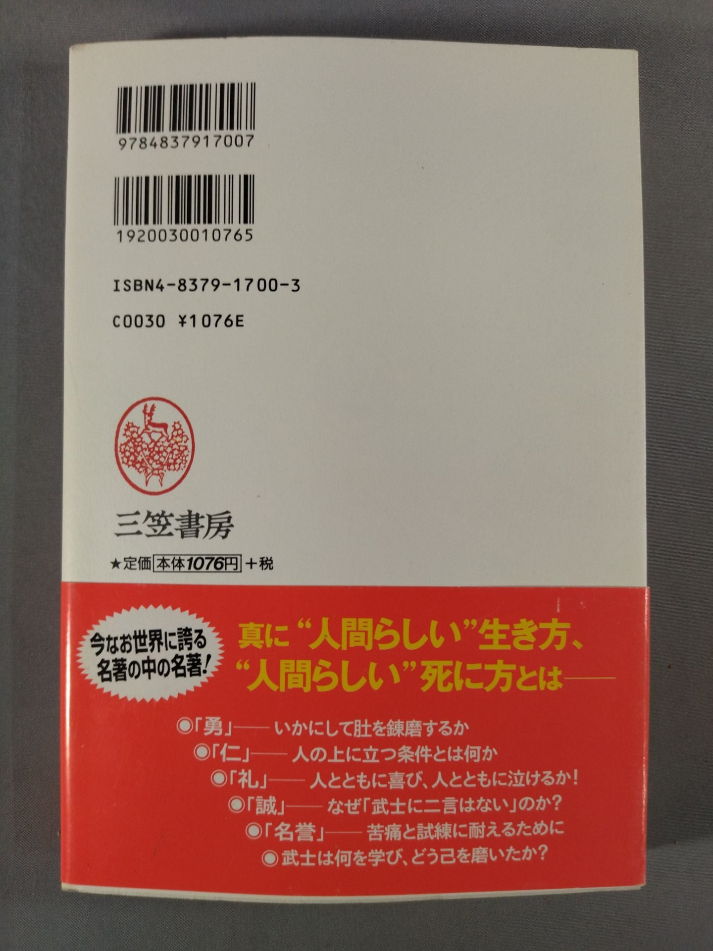 2003 Author: Nitobe Inazo, Translation and commentary: Tatsuya Naramoto / Tan (softcover) Mikasa Shobo / "Righteousness" is the shining and supreme pillar of Bushido, "Jin" is to stand above others, and "Honor" is to endure trials. This book brilliantly elucidates the essence of Bushido, which gave rise to a strong spirit. It is important for all modern people to know what the samurai learned and how they improved themselves. Tatsuya Naramoto has translated the best masterpiece written in English and caused a great stir among Westerners in a plain style.
