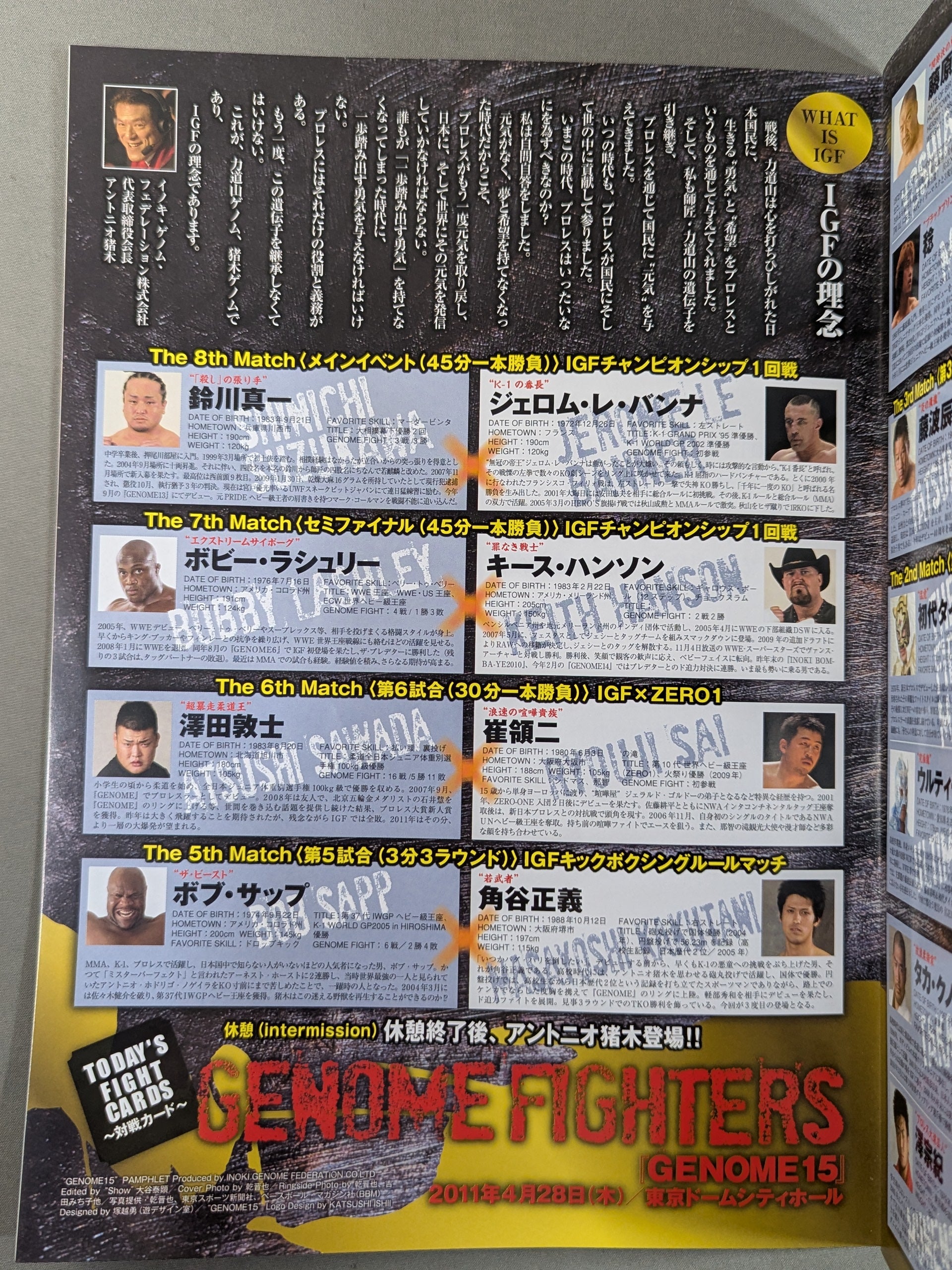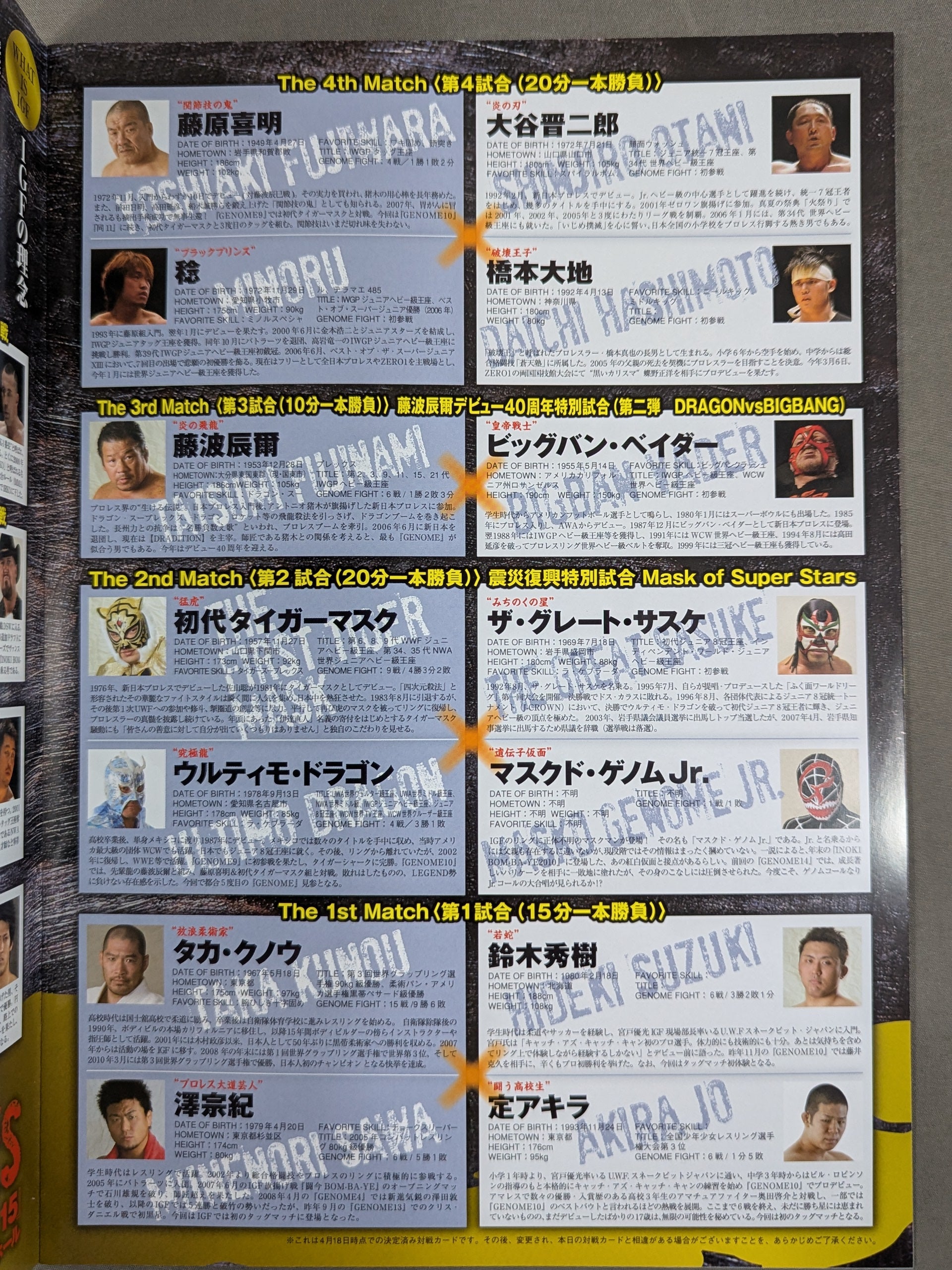 Venue: Tokyo Dome City Hall / list of the matches is printed : Shinichi Suzukawa vs Jerome Le Banner / [Tatsumi Fujinami Debut 40th Anniversary Special Match] Tatsumi Fujinami vsBig Van Vader