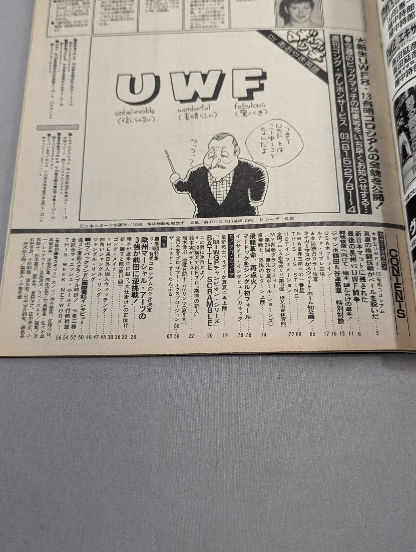 1988 The full picture of the new UWF8 and 13 Ariake Coliseum is released! / Pin-up: Nobuhiko Takada Cover: Akira Maeda , Nobuhiko Takada, Kazuo Yamazaki, Takeshi Caesar