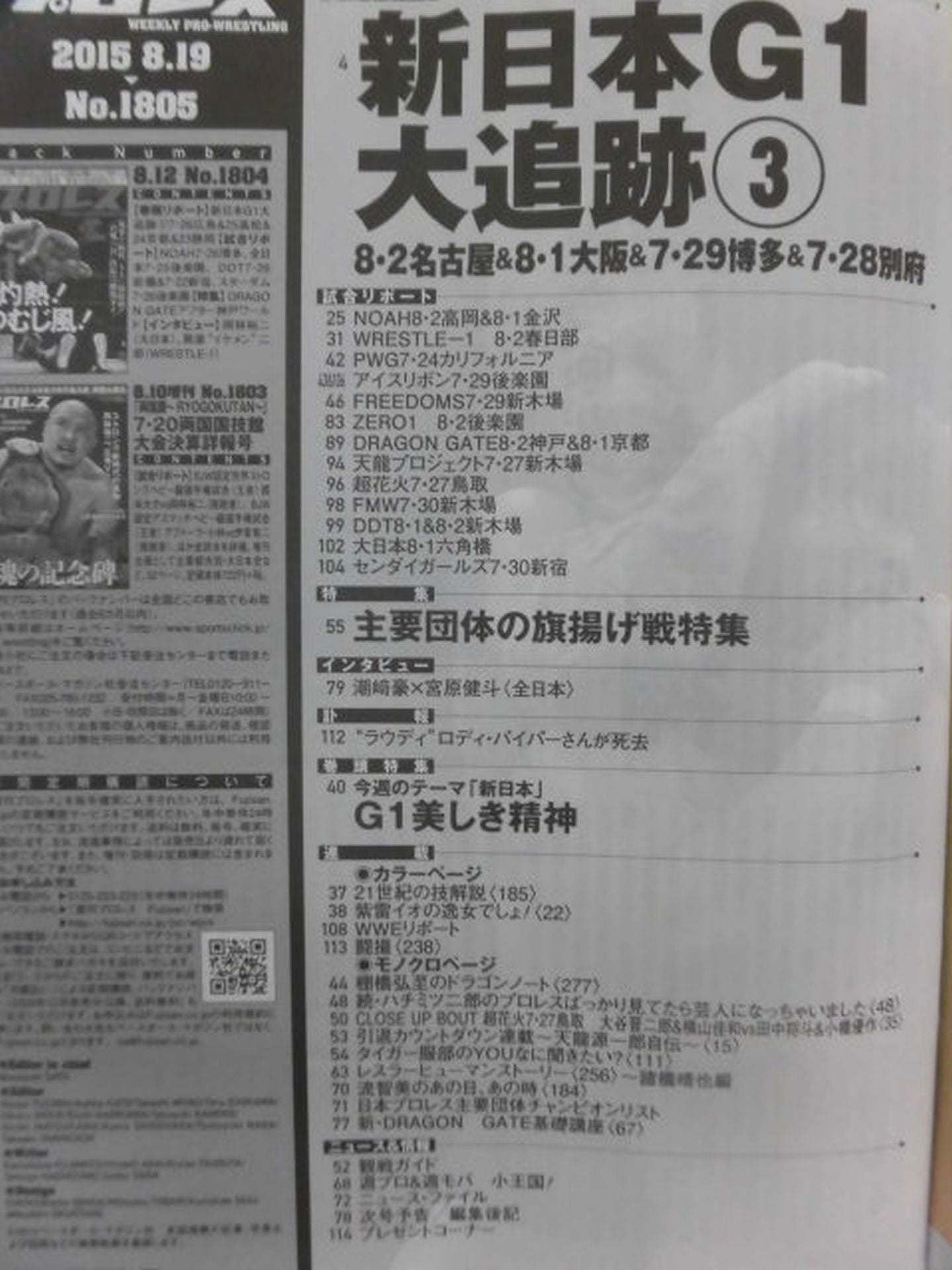 2015 G1 Extreme Summer! Beautiful spirit / Exciting first confrontation, Shibata wins Nakamura returns to the line for the first time in four tournaments / Kohei Joyful Fire Festival V / Shiozaki & Miyahara's "Wait for Generation Struggle!" / Tenryu 's last opponent is Okada!? / Roddy Piper dies Cover: Katsuyori Shibata , Kota Ibushi