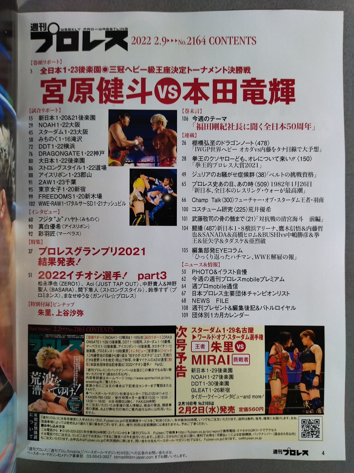 2022 [Preface Report] All Japan 1/23 Korakuen ◯ Triple Crown Heavyweight Championship Tournament Final Kento Miyahara vs Tatsuki Honda / 【Feature】 Pro Wrestling Grand Prix 2021 Results Announced!・2022 Best Fighters ! part3 / [Endnote] "Interview with President Takenori Fukuda on the 50th Anniversary of All of Japan" / [Special Appendix] Pin-Up Saya Kamitani / Cover: Kento Miyahara
