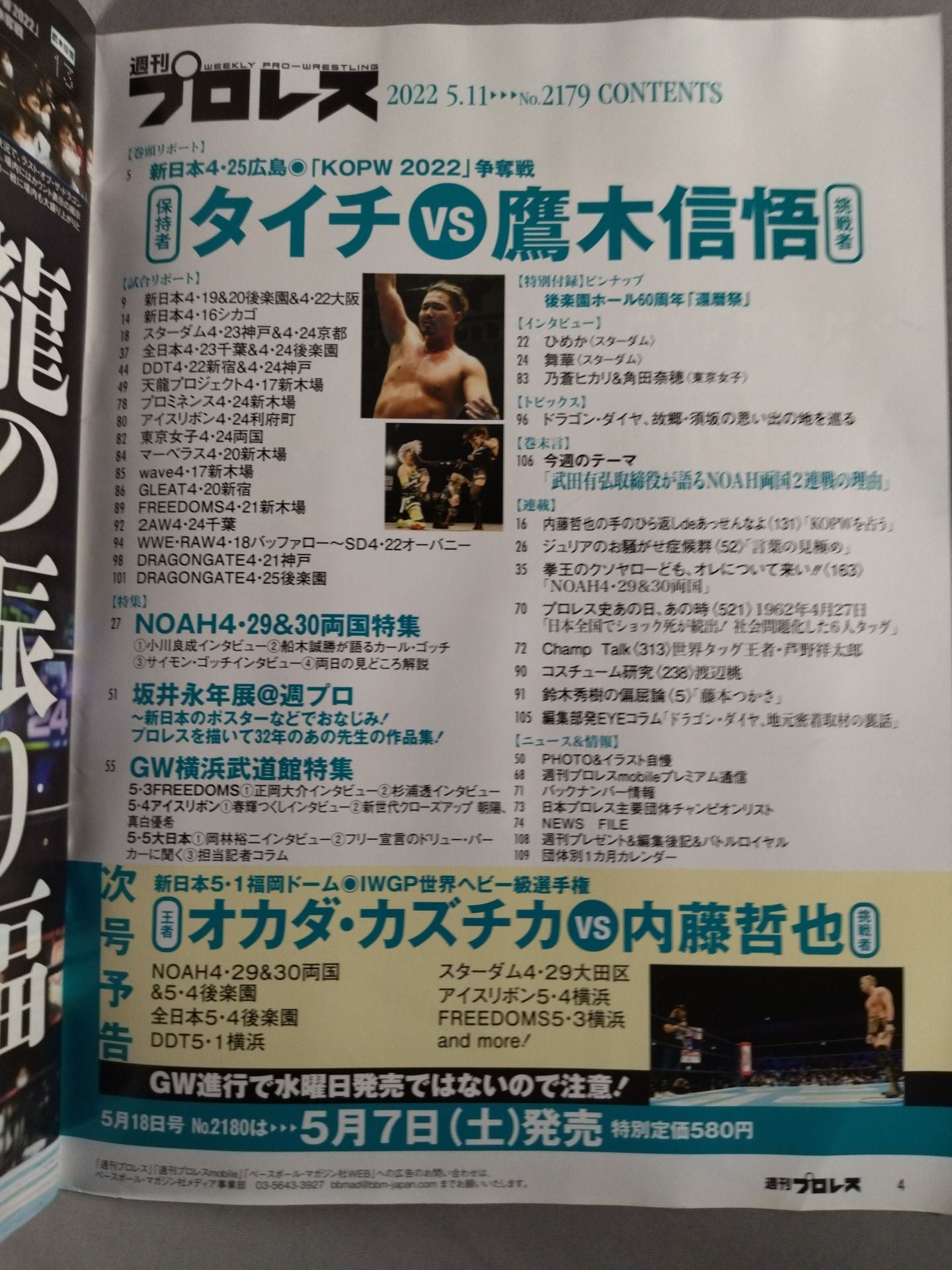 2022 Takagi Shiki REBORN / New Japan Pro Wrestling 4/25 Hiroshima: Taichiand win a tough "30 count match" and capture KOPW! Who is Simon Gotch?... NOAH Ryogoku Special Feature / STARDOM: Maihime Interview etc. / ○ Special Appendix Pin-Up: Hiroshi Tanahashi & Kento Miyahara and Korakuen Hall Women's Participation in the "Reincarnation Festival" Fighters Gathering Cover: Shingo Takagi