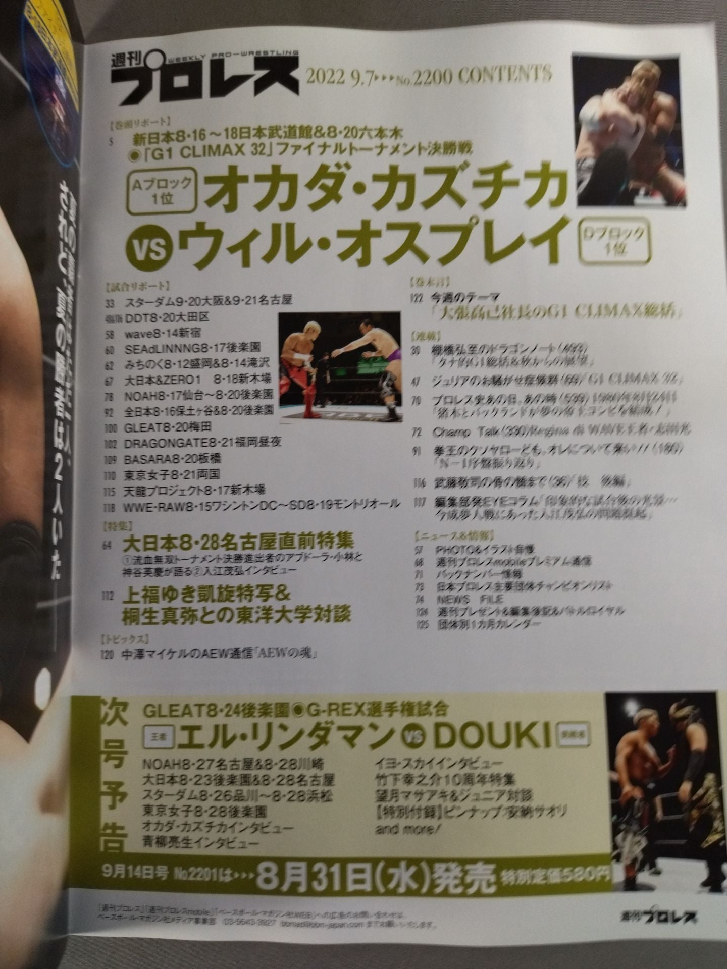 2022 Summer G1 Hot Rain / [Introductory Report] New Japan Pro Wrestling 8・16~18 Japan Budokan &8・20 Roppongi ○ "G1 CLIMAX 32" Final Tournament Final Match (1st place in A Block) Kazuchika Okada vs Will Ospreay (D Block 1st) / Stardom 8/20 Osaka & 8/21 Nagoya Detailed Report, etc. Cover: Kazuchika Okada
