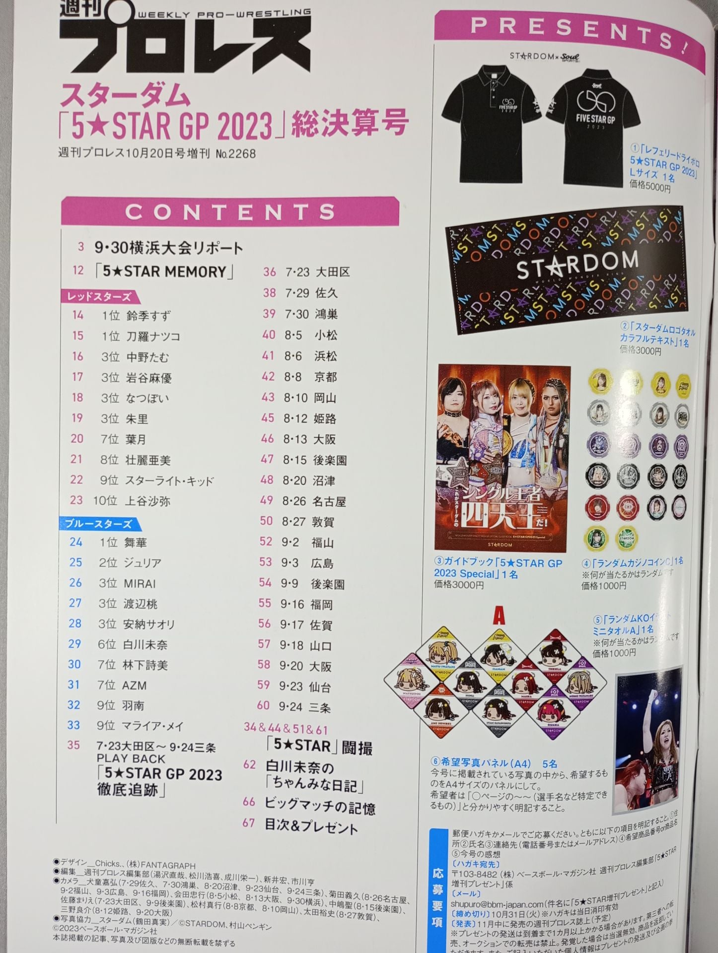 Stardom "5★STAR GP 2023" Summary Issue / 9/30 Yokohama Games Report "5★STAR MEMORY" 7/23 Ota Ward ~ 9/24 Sanjo PLAY BACK "5★STAR GP 2023 Thorough Tracking" "5★STAR" Fighting Shot Mina Shirakawa 's " Chanmina Diary" Memories of a Big Match Cover: Suzu Suzuki