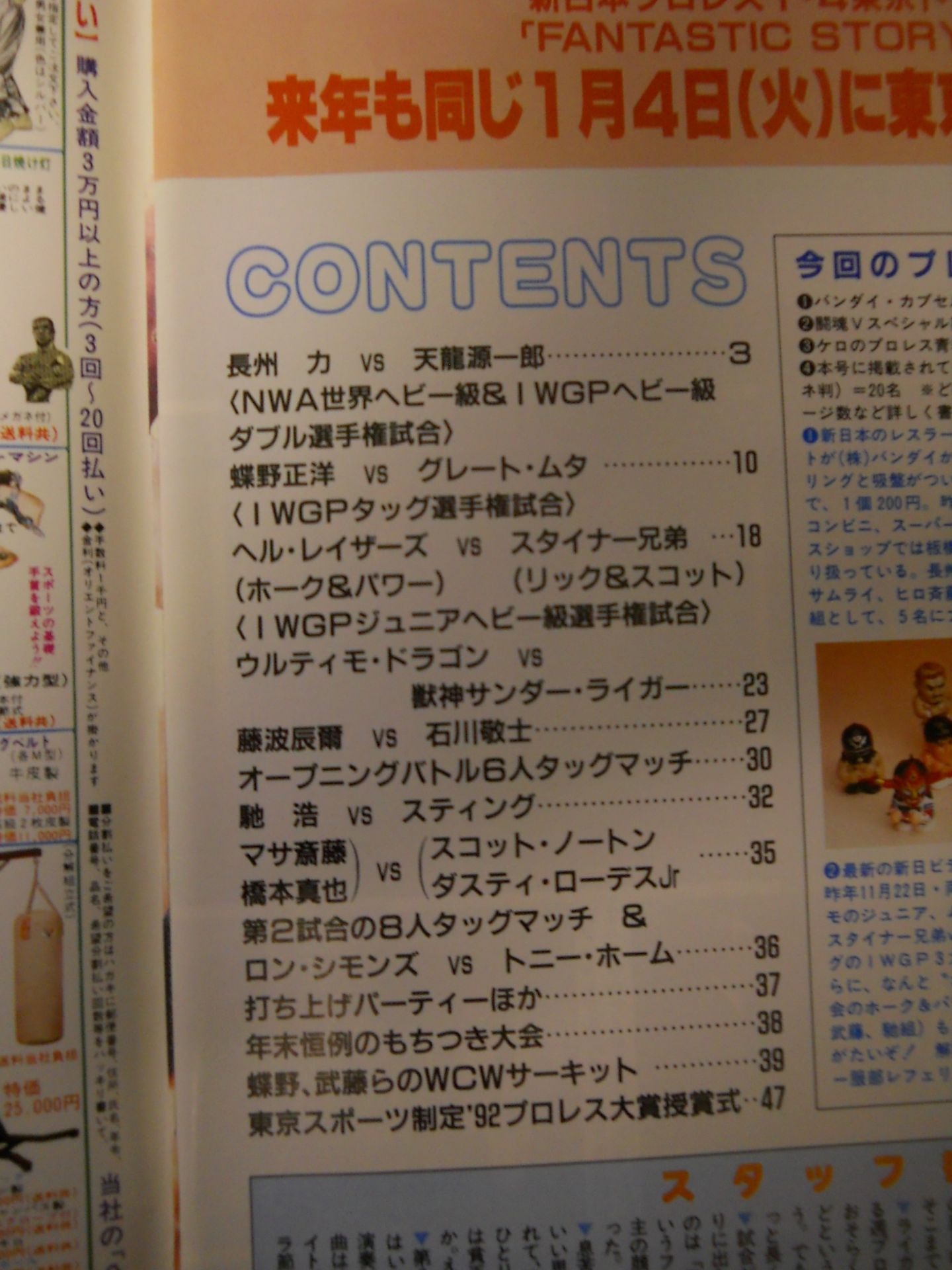 1993 Super Dome Final: Tenryu defeats Riki Choshu by fall, Muta also wins the NWA Title! Liger defeats Ultimo 1.4 Tokyo Dome Bulletin Cover: TenryuGenichiro , Riki Choshu