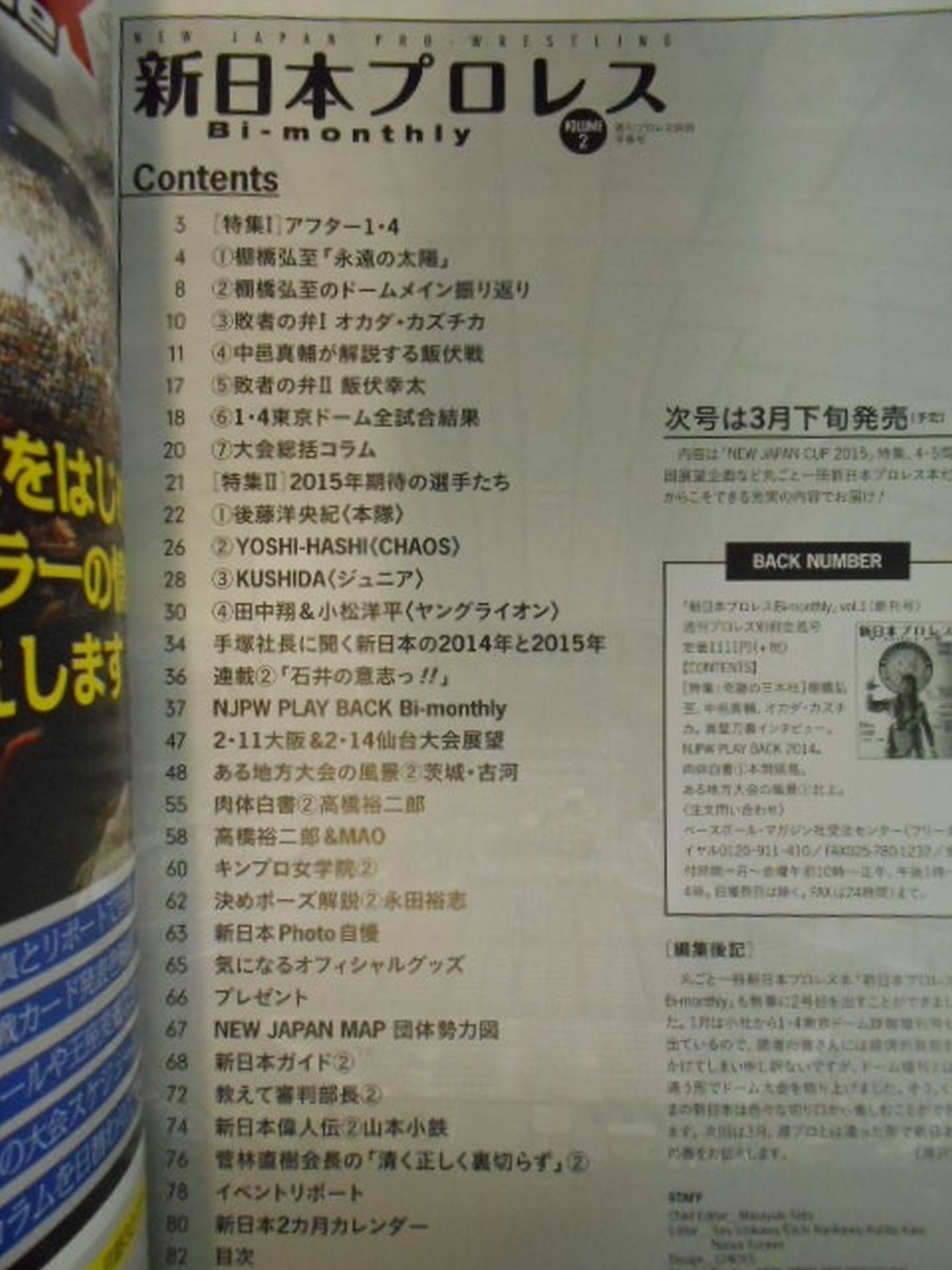 2015 [Special Feature I: After 1 & 4] "Glorious V5" Hiroshi Tanahashi "Iibushi Battle Commentary" Shinsuke Nakamura "The Lost to the Dome" Kazuchika Okada Kota Ibushi
