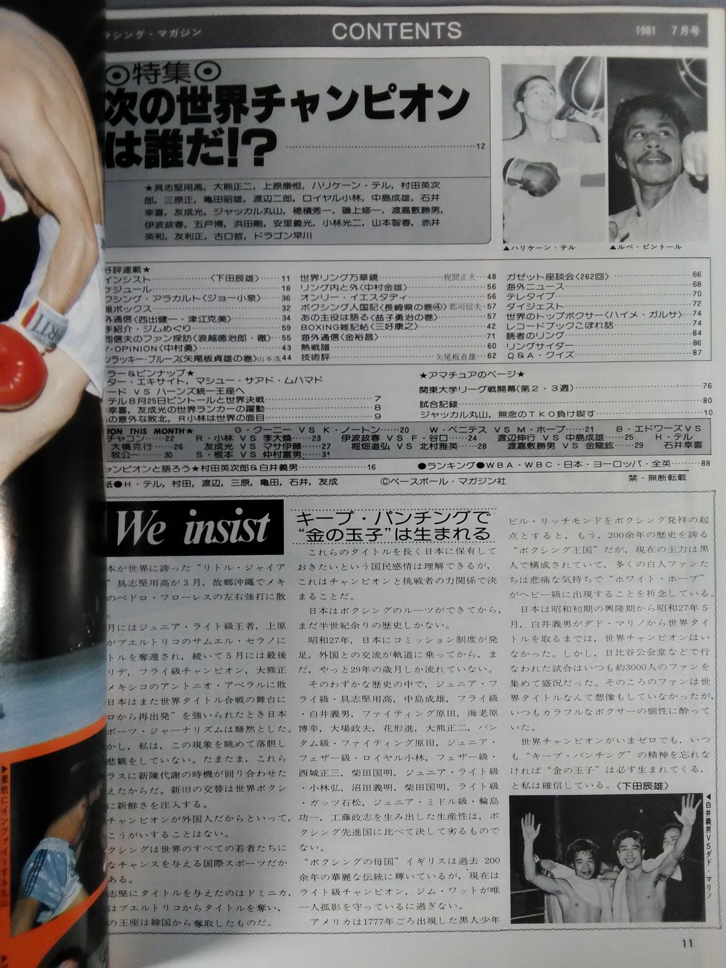 Who will be the next world champion in 1981? What about the departure of veterans such as Gushiken, Okuma, and Uehara? What are the trends of H-Tel, Murata, Mihara, Kameda, Ishii, Tomonari, Watanabe, and others in the world challenge? Eijiro Murata & Yoshio Shirai Benitez wins the feat of winning three weight classes! / [Appendix] ◯ Pin-Up (Matthew Saad Muhammad / Leonard vs Hearns for the Unified Title) Cover: H. Tell, Murata, Watanabe, Mihara, Kameda, Ishii, Tomonari