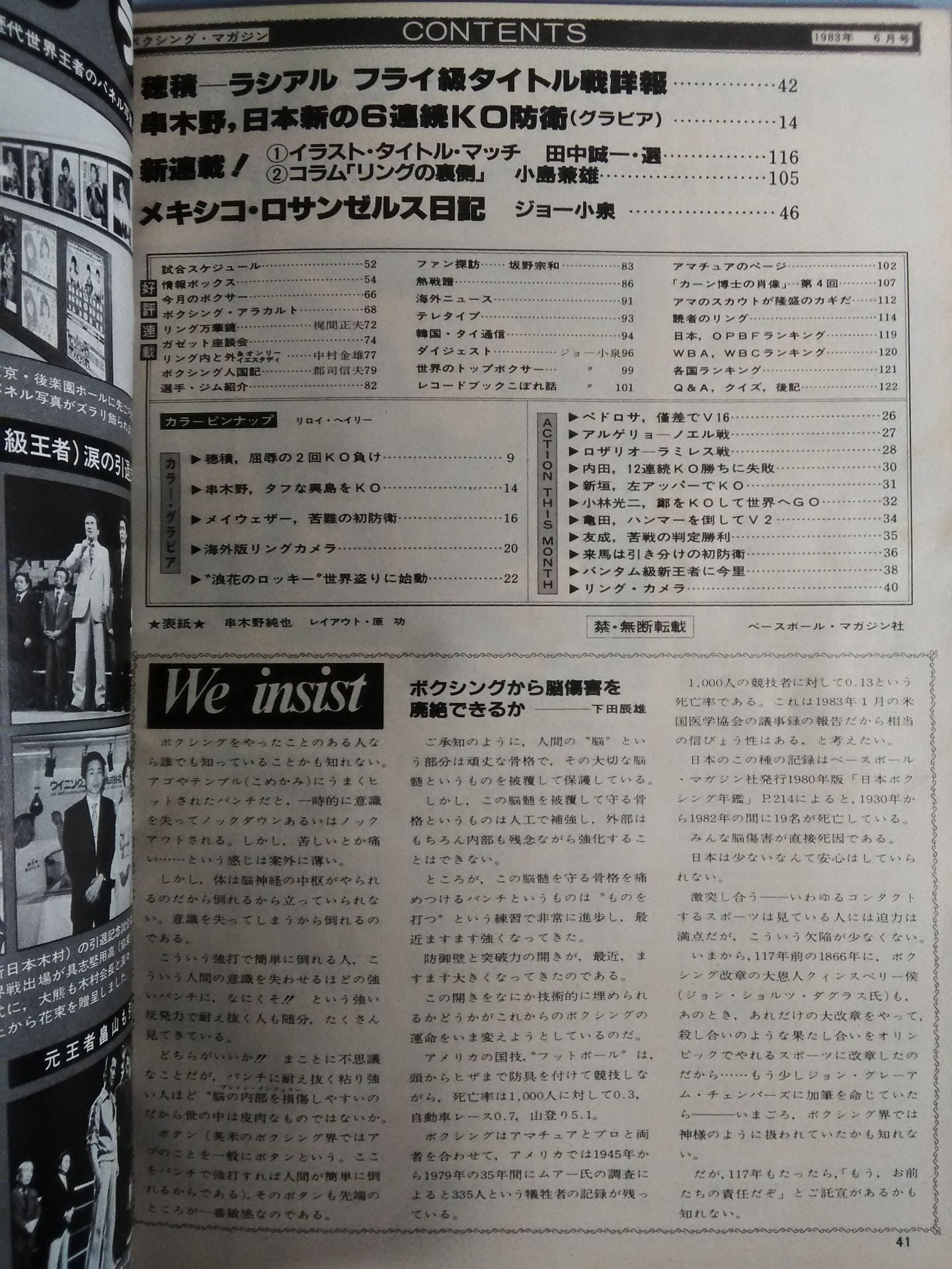 1983 Shizuoka Battle! Racial vs Hozumi Kushikino defends 6 consecutive KOs for Shin Japan Rosario for vacant L-class title Mayweather successfully defends for the first time Koji Kobayashi, KO win by Kaishin Amateur Kanto University League Match 1st Week / [Appendix] ◯ Pin-Up (Leroy Haley) Cover: Junya Kushikino
