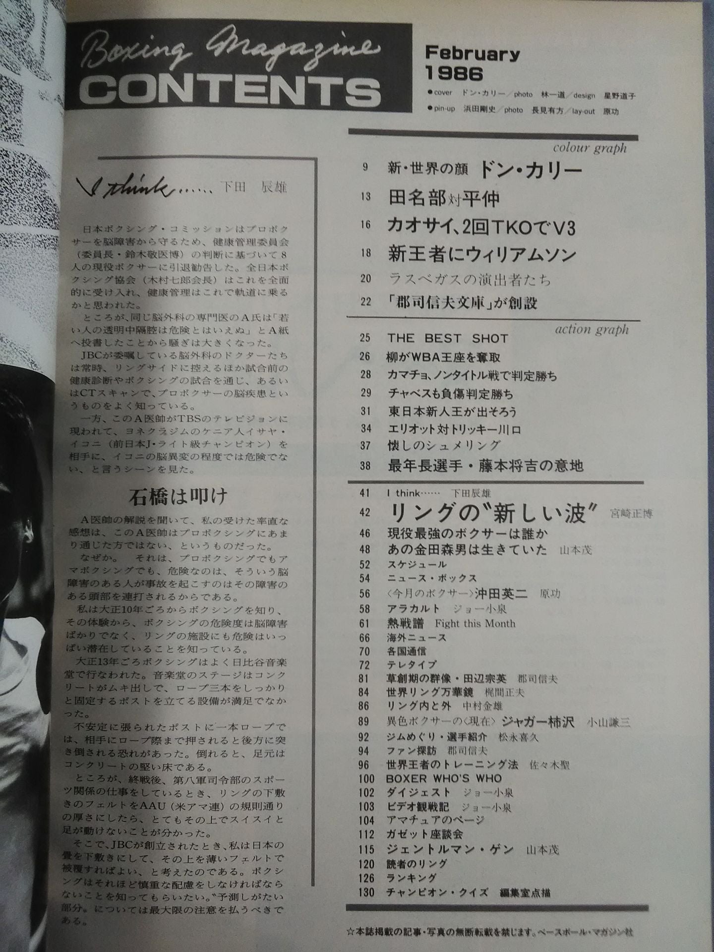 1986 The New Face of the World Don Curry Korea Dominates World J. Flyweight Williamson as New Champion "New Wave" in the Ring Morio Kaneda Was Alive The Meaning of the Oldest Man, Masakichi Fujimoto Founding of "Nobuo Gunji Bunko" / [Appendix] ◯ Pin-Up (Takeshi Hamada) Cover: Don Curry