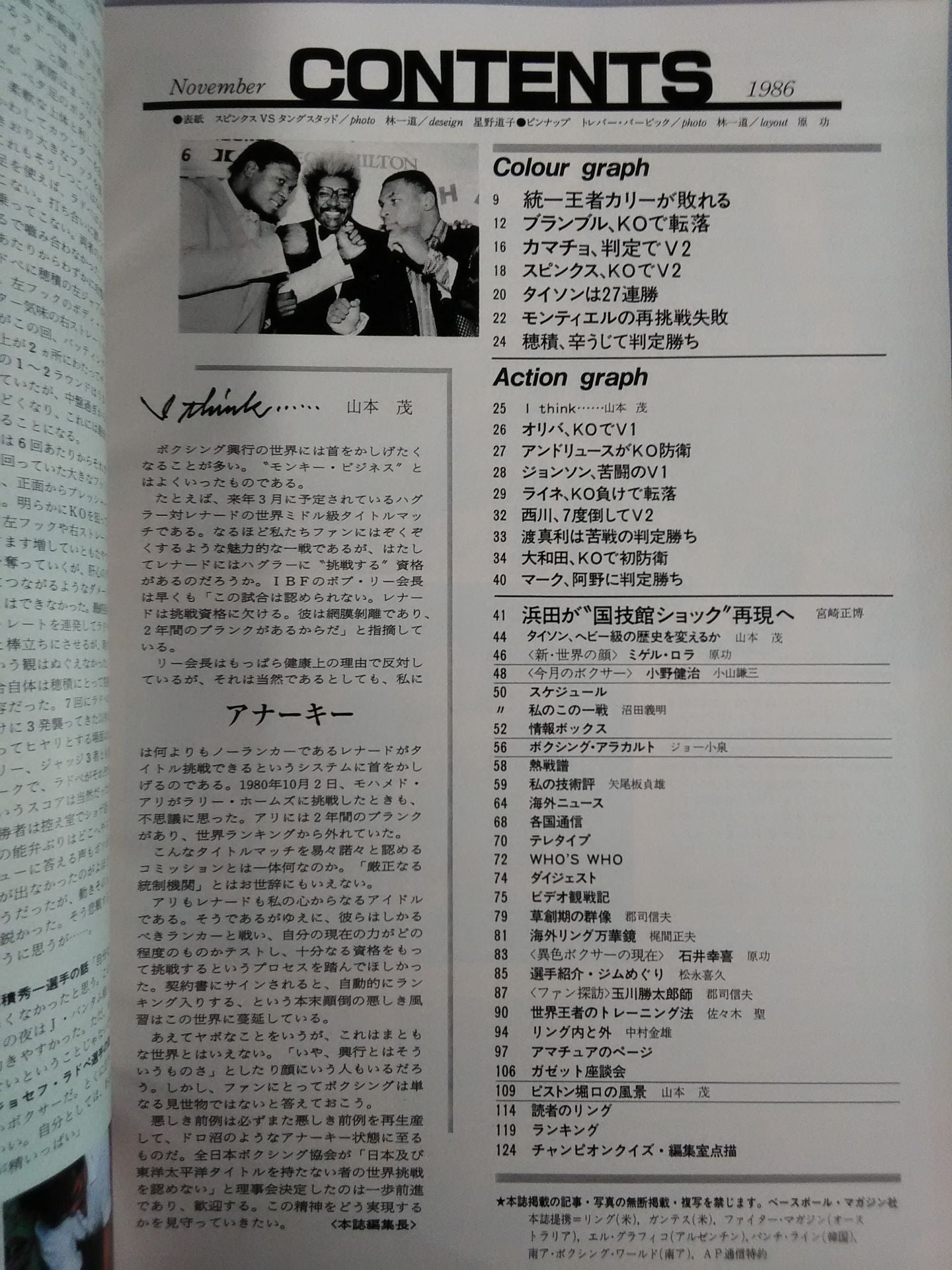 1986 Hamada's first defense, decided to be sticker Camacho V2 Bramble loses Curry also falls for the title Spinks V2 Tyson wins 27 consecutive matches Montiel fails to try again Nishikawa defeats Tanaka 7 times V2 Owada V1 in Kyushu / [Appendix] ◯ Pin-up (Trevor Barbick) Cover: Michael Spinks vs Stefan Tungstad