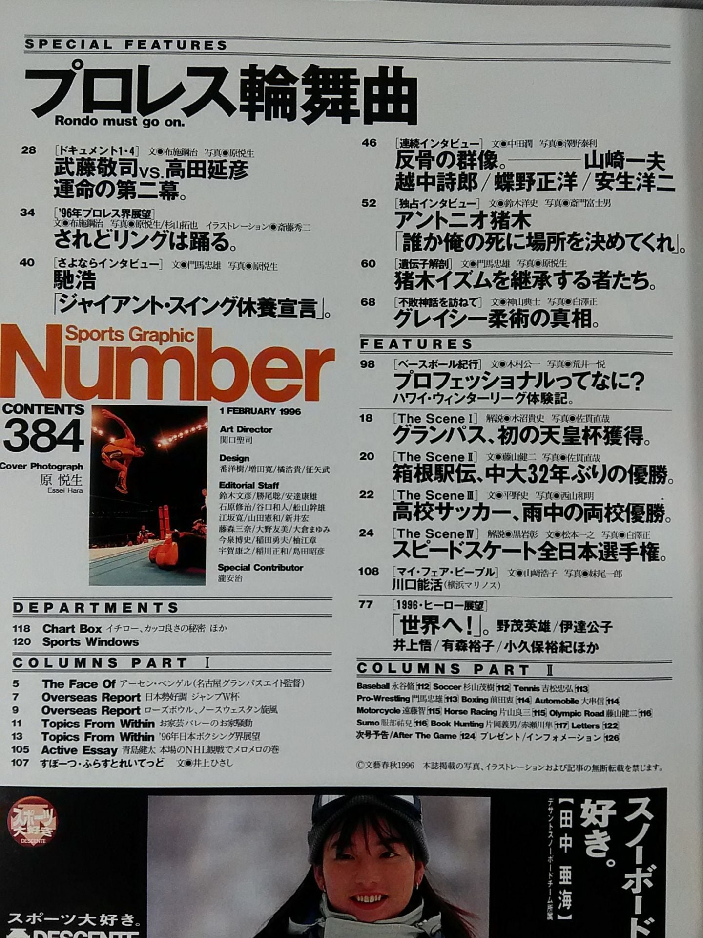 1996 Pro Wrestling Ring Dance Document 1.4 Muto VS Takada Fateful Act 2 Hiroschi HaseFarewell Interview "Giant Swing Rest Declaration" Antonio Inoki "Somebody Decide Where I'm going to die" Rebellious group image (Continuous interviews: Yamazaki, Eshinaka, Chono, Ansei) The Truth About Gracie Jiu-Jitsu (Visiting the Myth of Invincibility) Cover: Muto Keiji VS Nobuhiko Takada