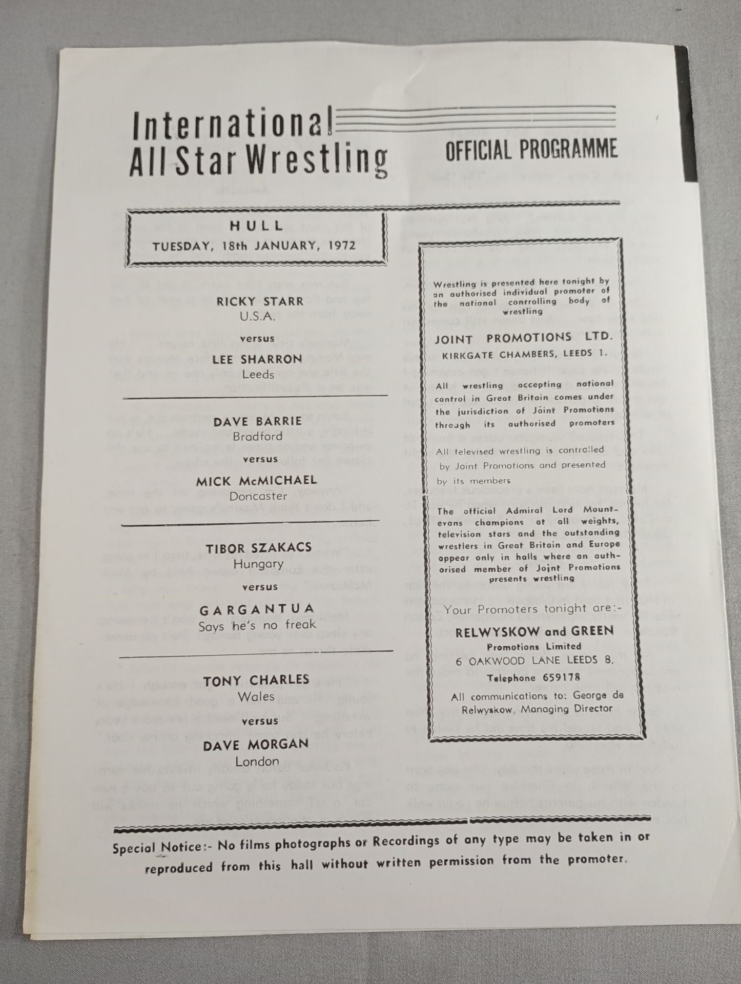 International ALL Star Wrestling OFFICIAL PROGRAMME / Full English notation list of the matches is printed : Ricky Starr vs Lee Sharon mat / "No." No notation