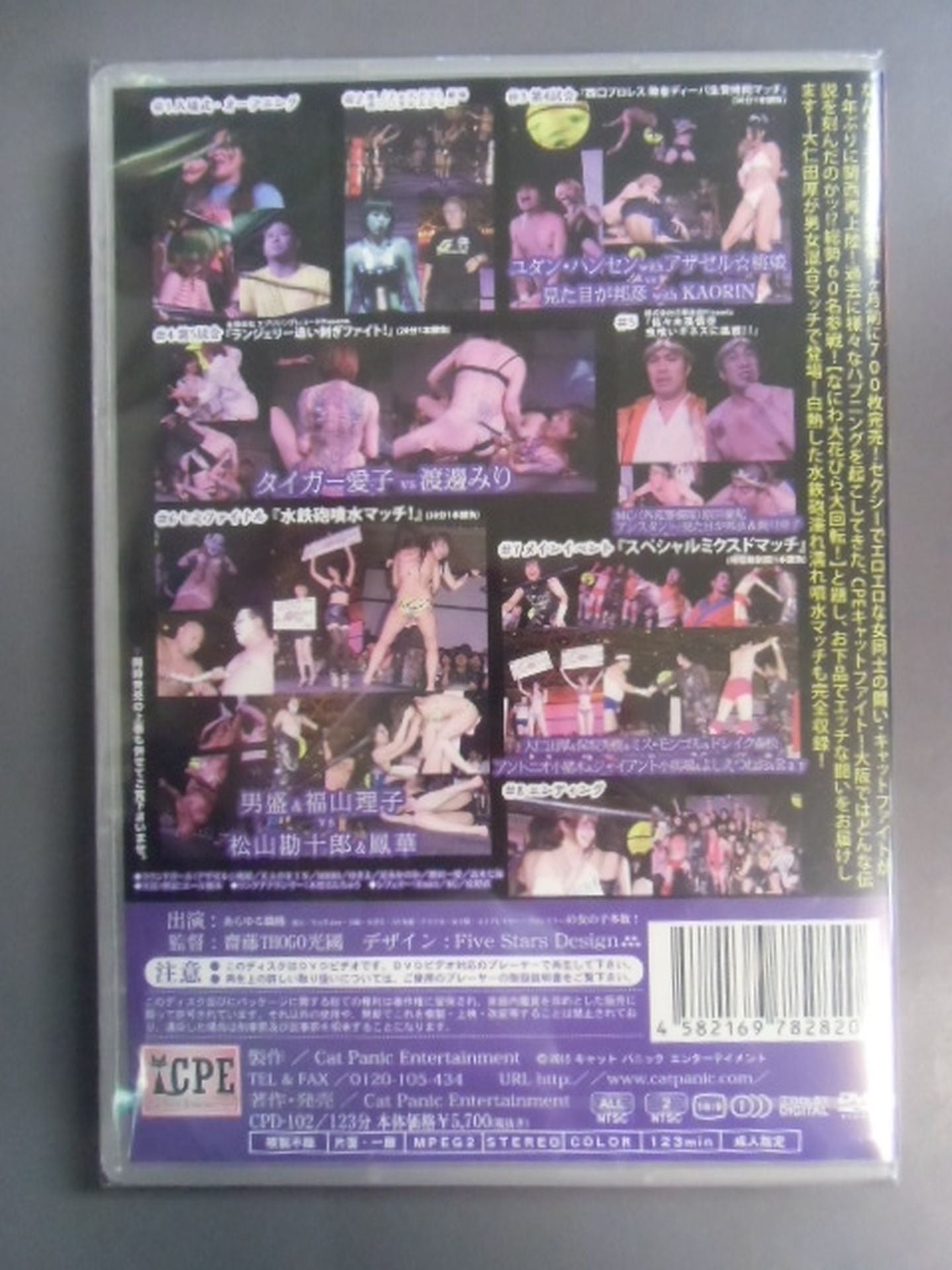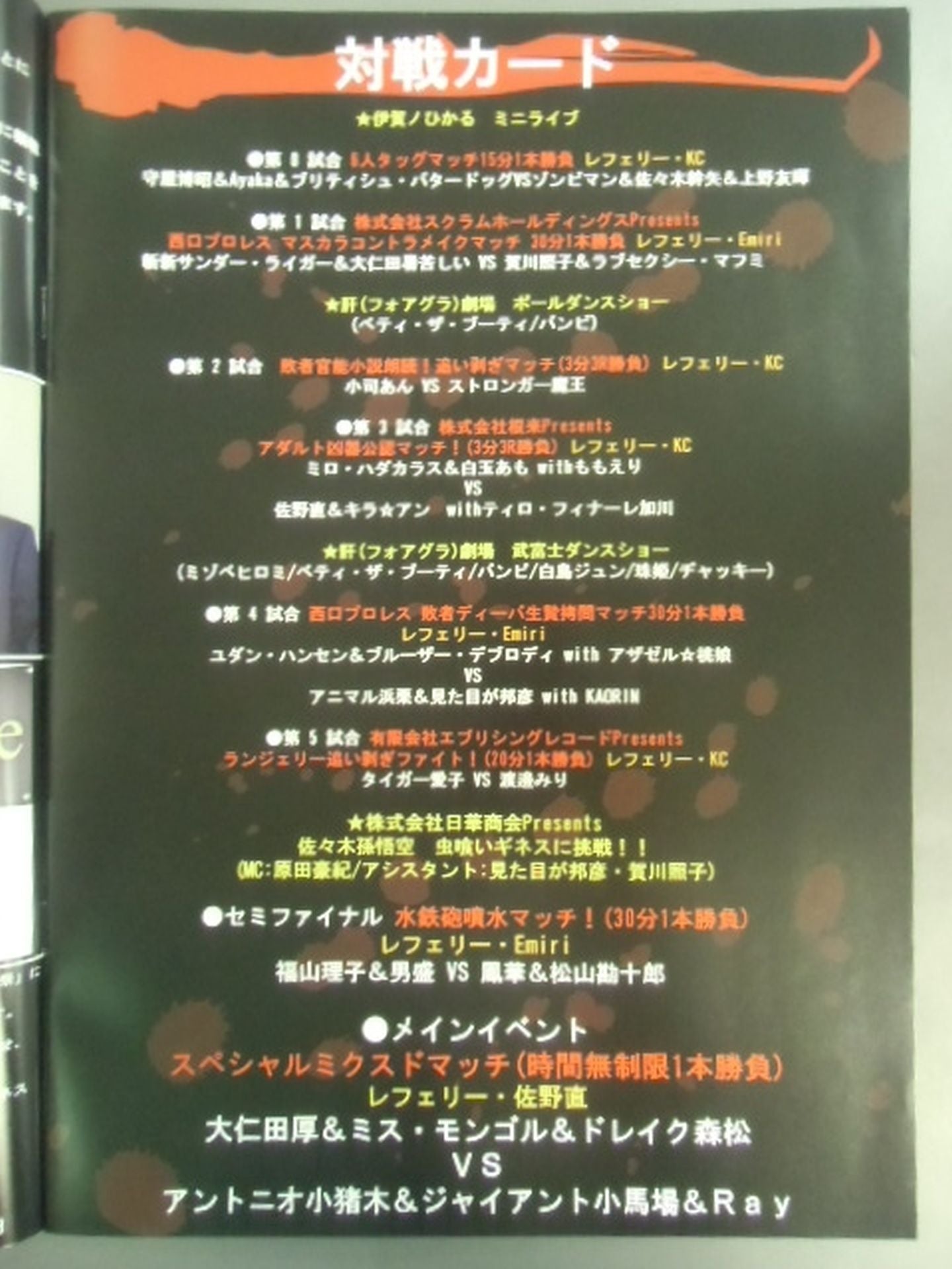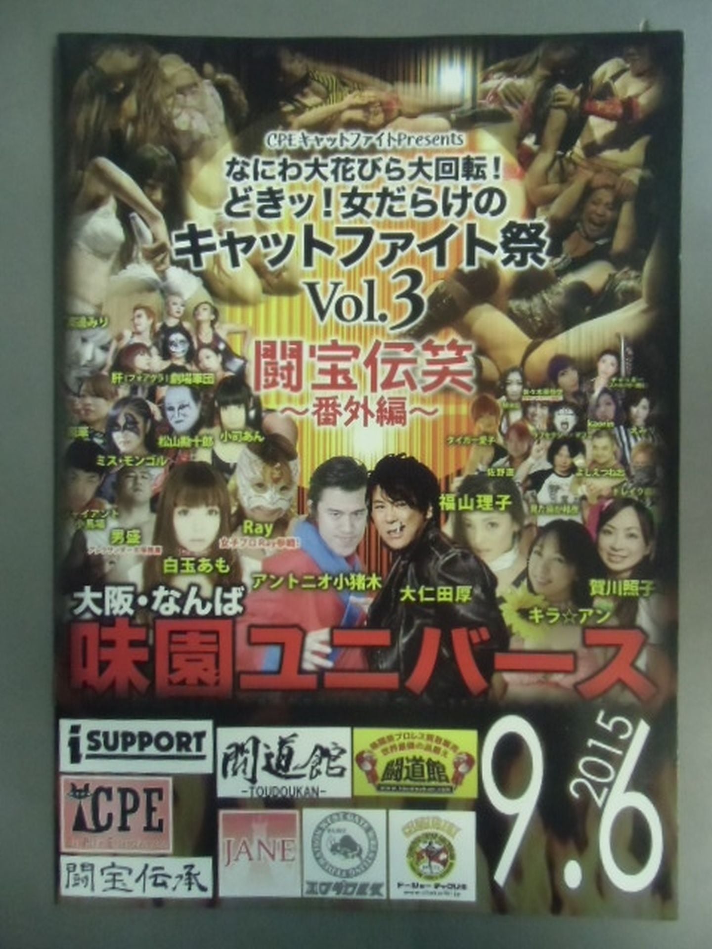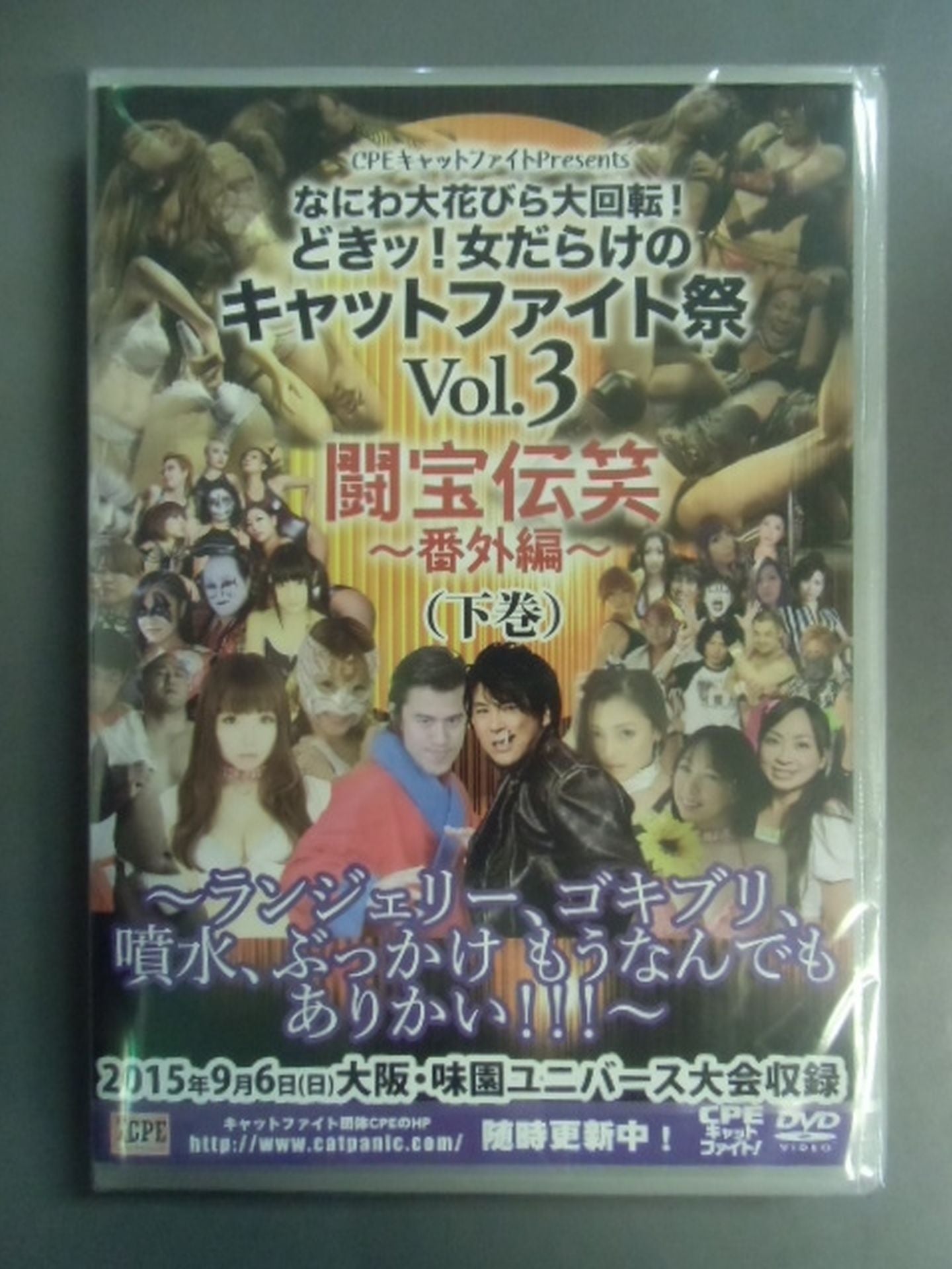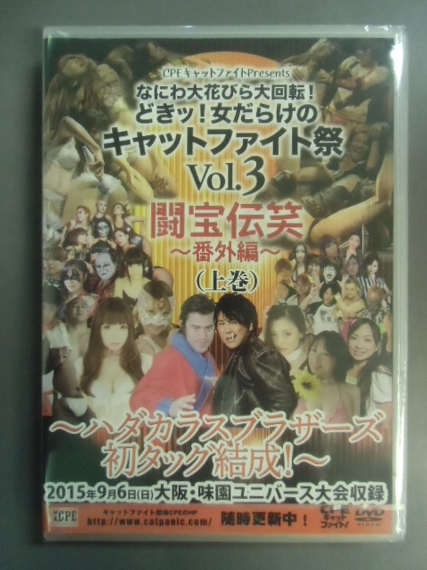 2015 First Volume (123 minutes) Second Volume (108 minutes) Fighting ★ Treasure Legend Laugh ~ Extra Edition ~ ★ September 6, 2015 (Osaka, Ajizono Universe Tournament) ★ Contents ★ of the first volume (1) Entrance ceremony (2) Hikaru Igano Mini Live (3) Match 0 Hirohiro Moriya & Ayaka & British Butterdog vs Zombie Man & Mikiya Sasaki & Yuki Ueno (4) Match 1 New Thunder Liger & Onita Hot Pain vs Teruko Kaga & Love Sexy Mafumi (5) Foie Gras Theater (6) Match 2 An Koji vs Stronger Demon King (7) Match 3 Milo Hadakaras & Amo Shiratama with Momoeri vs Nao Sano & Kira ☆ Anne with Tiro Finale Kagawa 8. Ending ★ Contents ★ of the second volume (1) Entrance ceremony (2) Foie gras theater (3) Match 4 Yudan Hansen with Azazel☆Momo Musume vs Kunihiko with KAORIN (4)Match 5 Tiger Aiko vs Miri Watanabe (5)Son Goku Sasaki Insect Eating Show (6)Semi-Final Otomori & Riko Fukuyama vs Kanjuro Matsuyama & Hana Otori (7)Main Event Atsushi Onita& Hideki Hosaka & Miss Mongolia & Drake Morimatsu vs Antonio Koinoki > Giant Kobaba & Yoshie Tsuneo & Ray