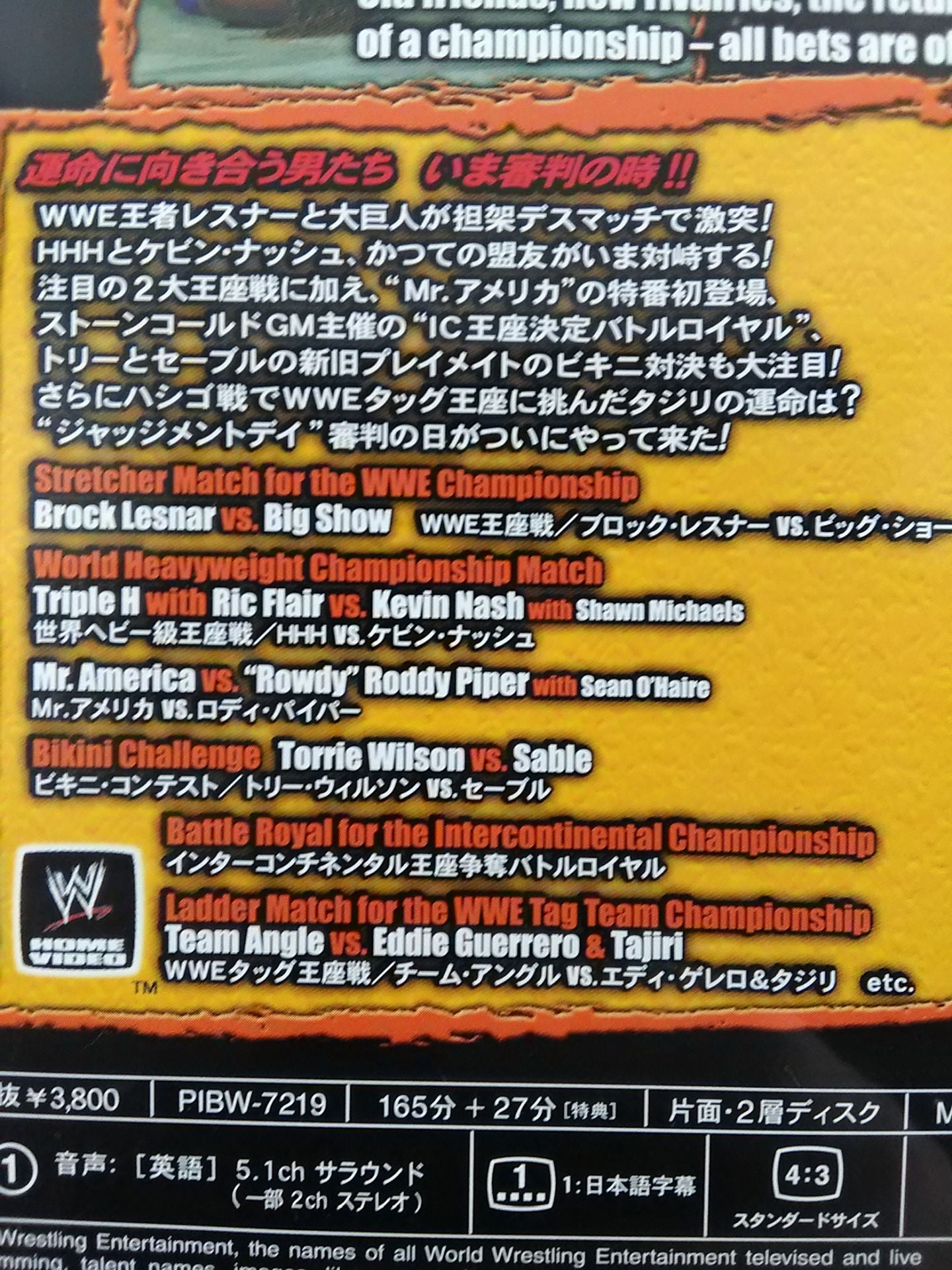 2003 Men Facing Fate: Now is the Time for Judgment! WWE Champion Lesnar and the Giants clash in a stretcher deathmatch! In addition to the two high-profile title battles, HHH and Kevin Nash , former allies now face off! What will be the fate of Tajiri as he challenges for the WWE Tag Team Titles in a ladder match? Judgment Day: Judgment Day has finally arrived!