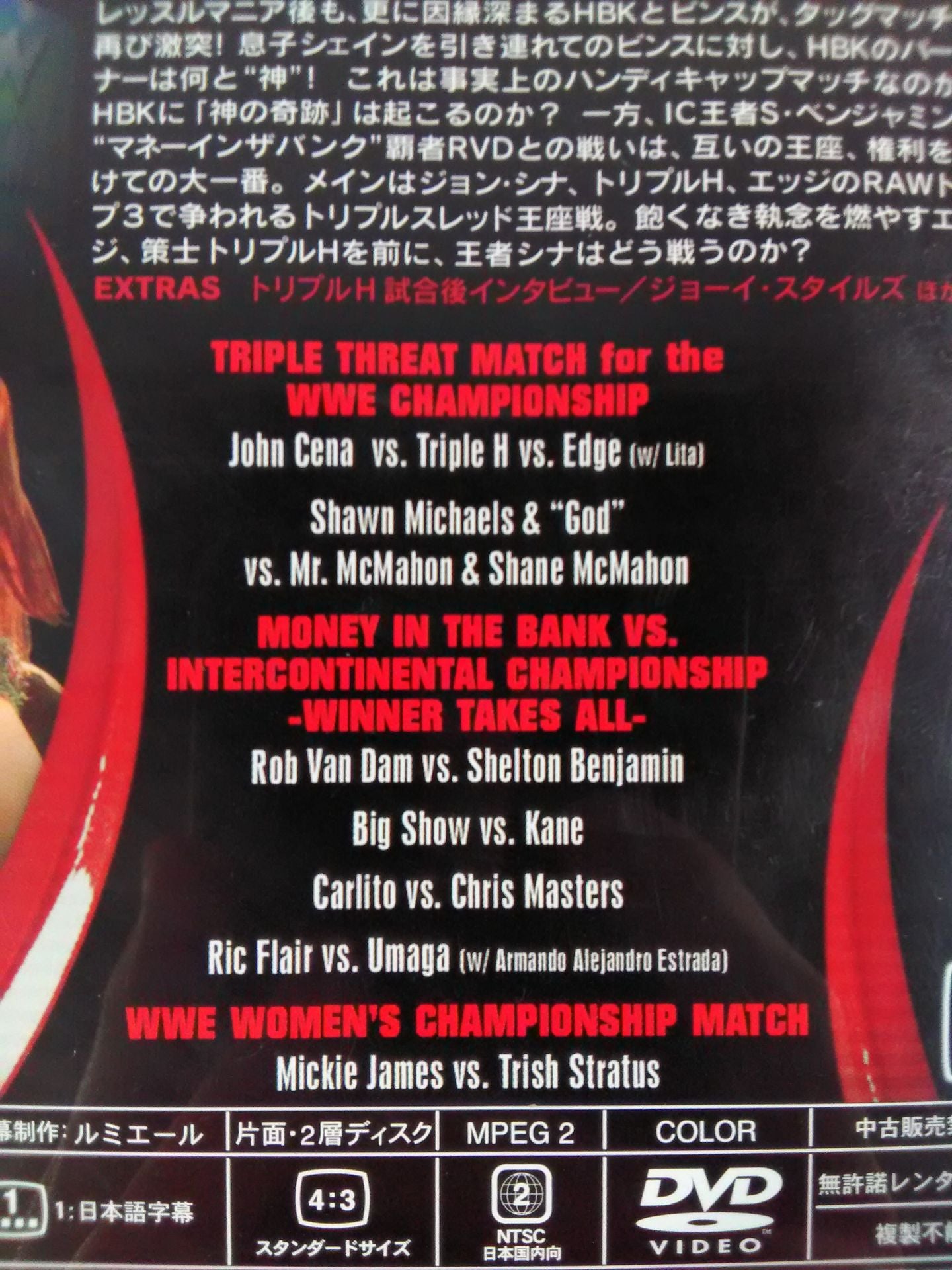2006 Recording of WWE's Pro Wrestling show "Backlash 2006" held since '99. Includes a triple match between John Cena , HHH, and EDGE for the WWE Title, and Vince McMahon against Shawn Michaels against No Holes Bird!