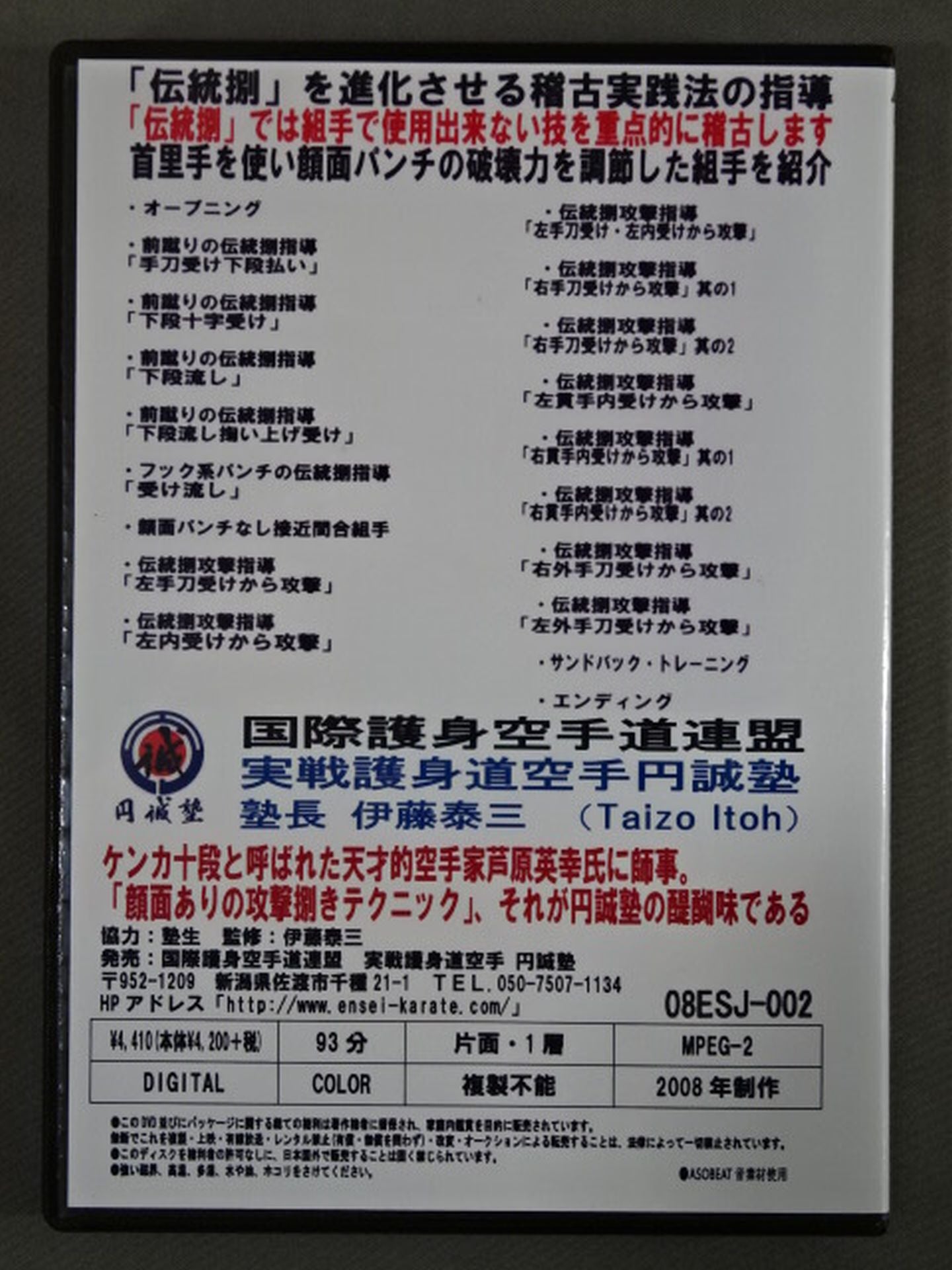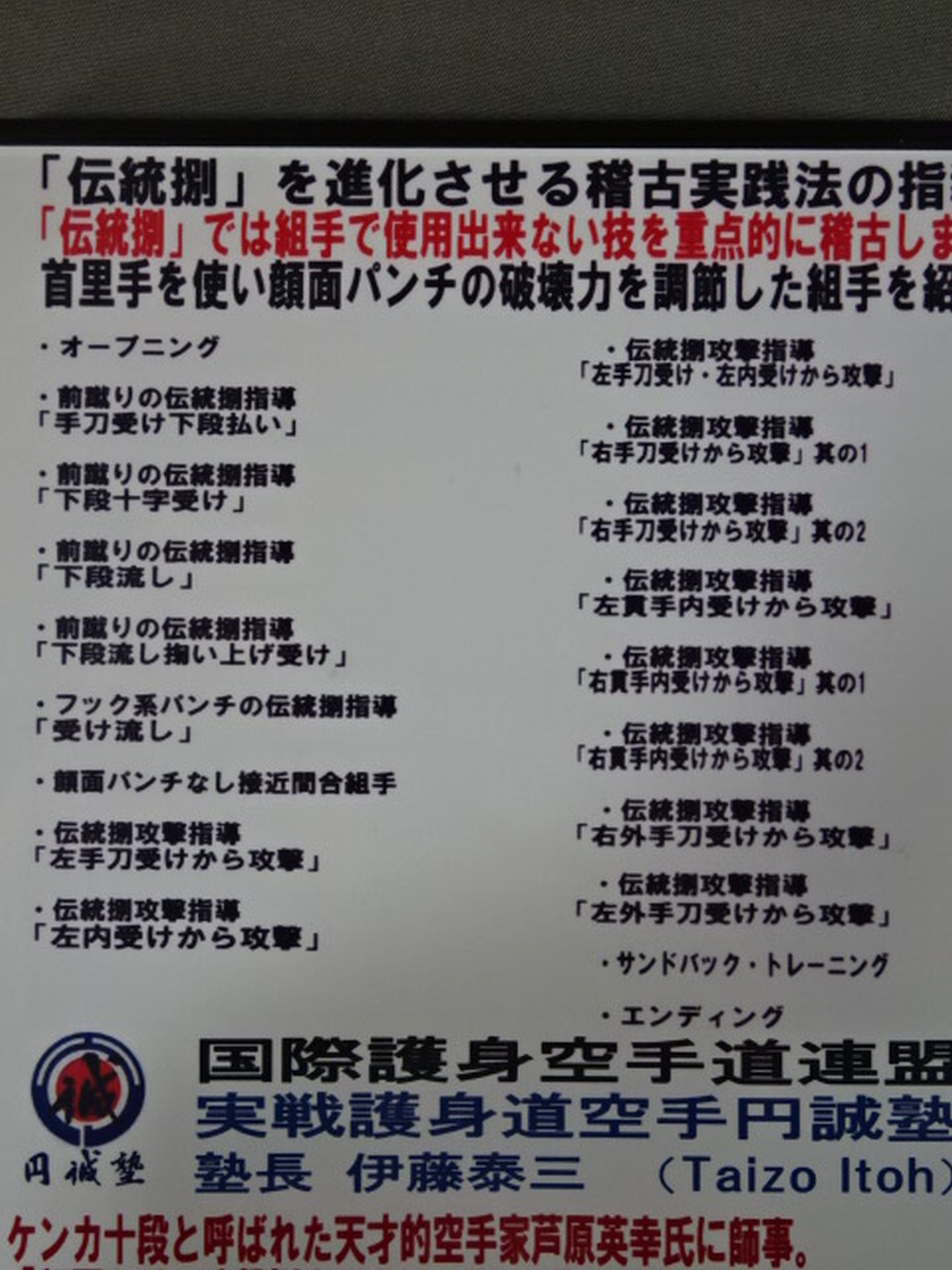 Opening, traditional hand kick instruction "lower sword receiving and lower payment", traditional front kick instruction "lower cross reception", traditional front kick instruction "lower step flow", traditional front kick instruction "lower step flow", traditional front kick instruction "lower step sink scooping up", traditional hook punch instruction "parrying", approach approach kumite without face punch, traditional attack instruction "attack from left hand sword receiver", traditional attack instruction "attack from left inner receiver", traditional attack instruction " Attack from the left hand sword receiver / left inner receiver ・ Traditional sword attack instruction "Attack from right hand sword receiver" Part 1 ・ Traditional attack instruction "Attack from right hand sword receiver" Part 2 ・ Traditional attack instruction "Attack from left hand inner receiver" ・ Traditional attack instruction "Attack from right hand inner receiver" Part 1 ・ Traditional attack instruction "Attack from right hand inner receiver" Part 2 ・ Traditional attack instruction "Attack from right outer hand sword receiver" ・ Traditional attack instruction "Attack from left outer sword receiver" ・Sandbag Training Ending