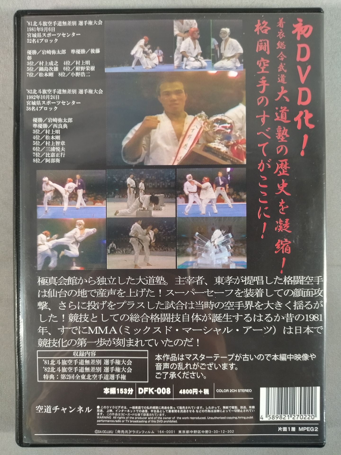 2018 First DVD release! Condensing the history of the clothed comprehensive martial art "Daido Juku"! All about KARATE Fighting is here! Complete the early tournament of Daido Juku, which revolutionized the KARATE world. That historic match has finally been revived on DVD! This is the first volume in a series that contains the early tournaments of the clothed comprehensive martial arts and daido juku founded by Takashi Azuma. The origin of the martial art, which is now called "Kudo", was in the era of advocating "fighting KARATE". Includes the 1981 and 1982 Hokuto Banner All-Japan Japan Fighters Rights Tournament, physical fitness and indiscriminate matches. [Recording contents] 1981 Hokuto Banner by physical strength & Indiscriminate 1982 Hokuto Banner by physical strength & Indiscriminate