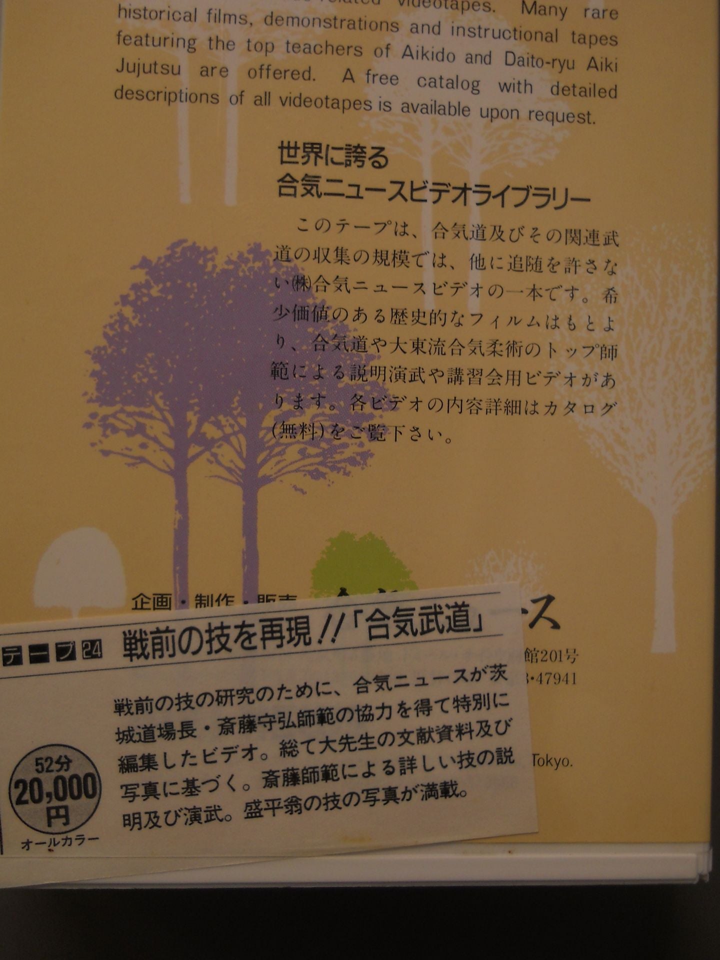 1989 A video specially edited by Aiki News with the cooperation of Morihiro Saito, the head of the Ibaraki Dojo, for the study of pre-war techniques. All are based on the literature and photo of the professor. Detailed explanation and demonstration of techniques by Master Saito. Full of photo of Morihei's technique.