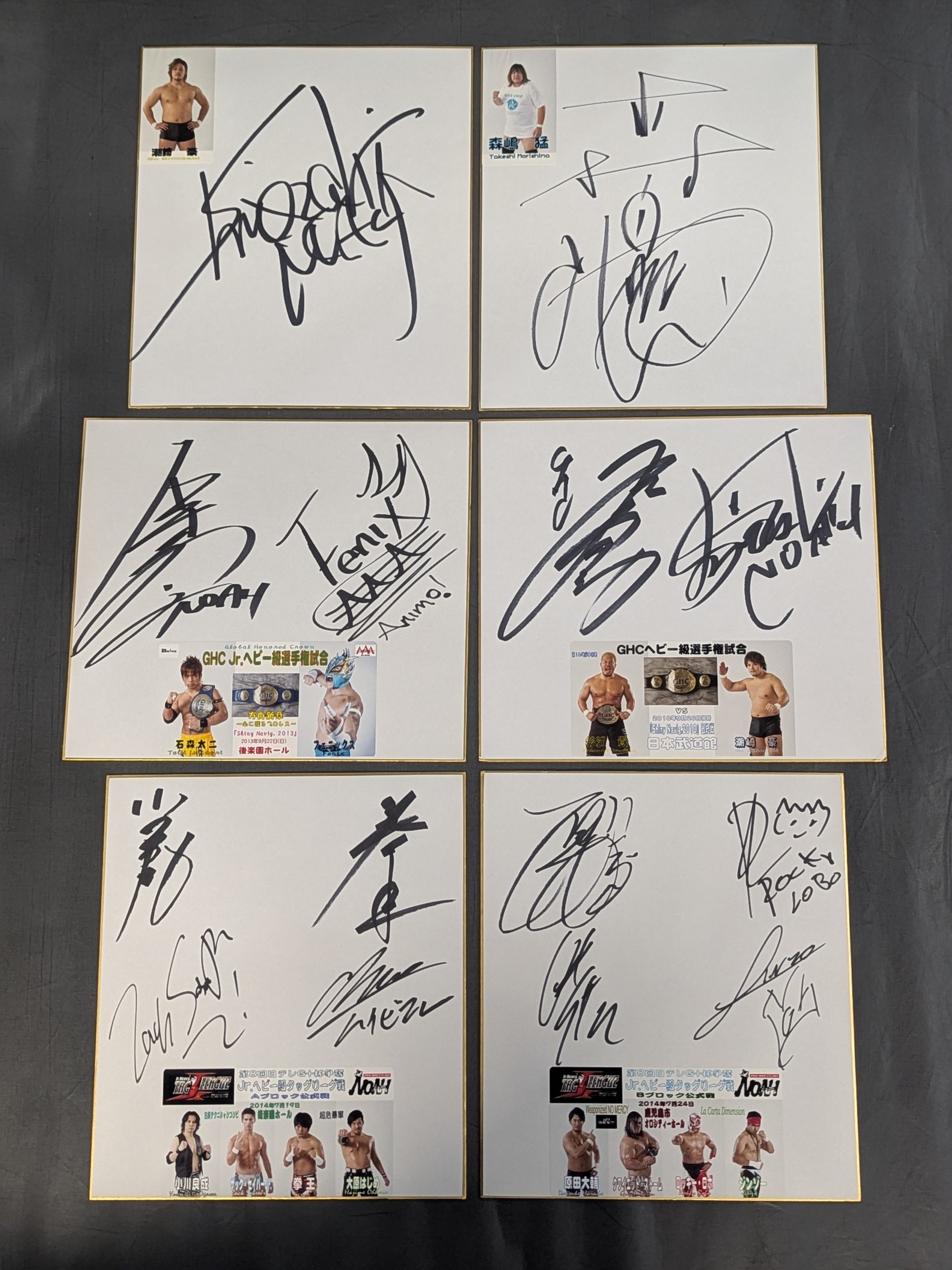 Go Shiozaki , Takeshi Morishima , Taiji Ishimori vs Phoenix, Takashi Sugiura vs Go Shiozaki , Yoshinari Ogawa & Zack Sabre Jr .vs. Kenoh & Hajime Ohara, Daisuke Harada & Quiet Storm vs. Rocky Robo & Jinzo, all 6 autographs above Shikishi ( Autograph board ) set!