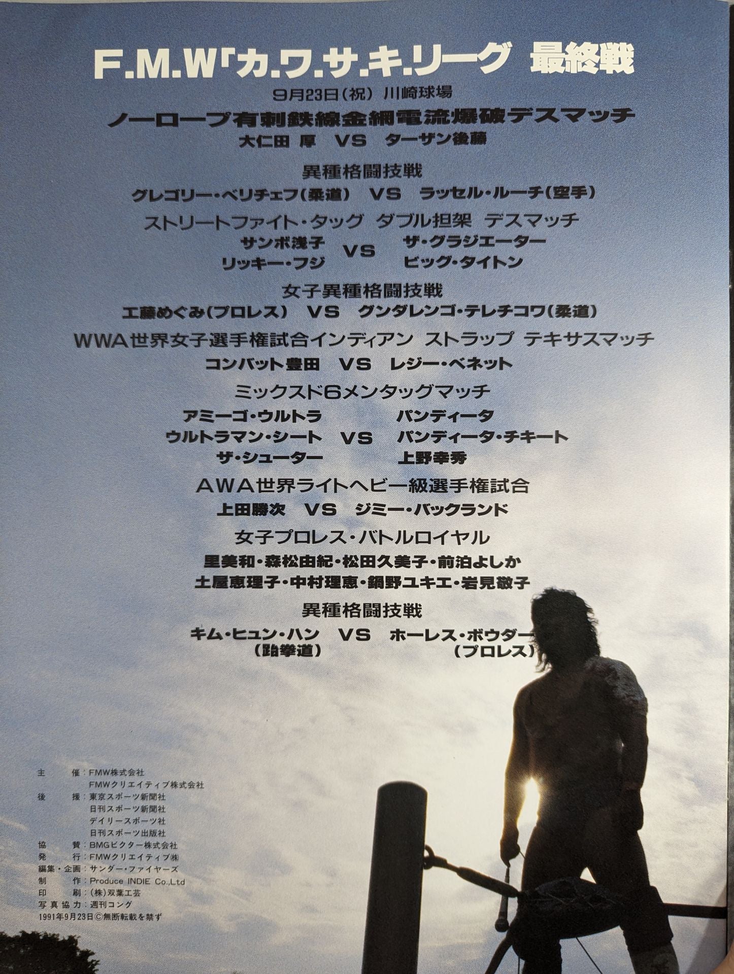 1991 Venue: Kawasaki Baseball Stadium / List of the matches is printed : 【No RopesBarbed Wire Wire Mesh Explosion Deathmatch] Atsushi Onita vsTarzan Goto / [Mixed Martial Arts Fight] Gregory Belichev vs Russell Rouch