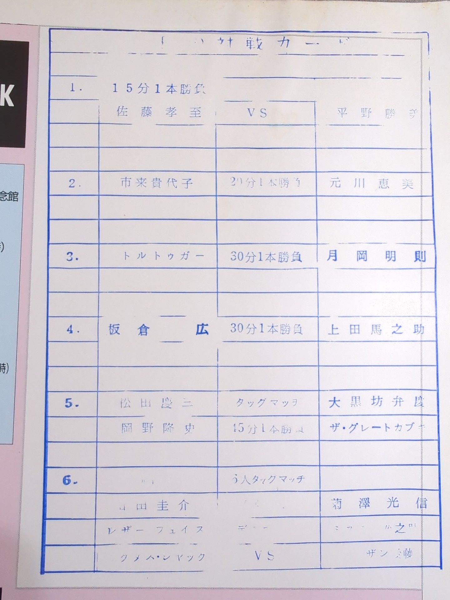 stamped with list of matches :Cactus Jack & Leather Face & Keisuke Yamada vs Tarzan Goto & Mr. Gannosuke & Mitsunobu Kikuzawa NEW YEAR '96 BOUND TO BREAK