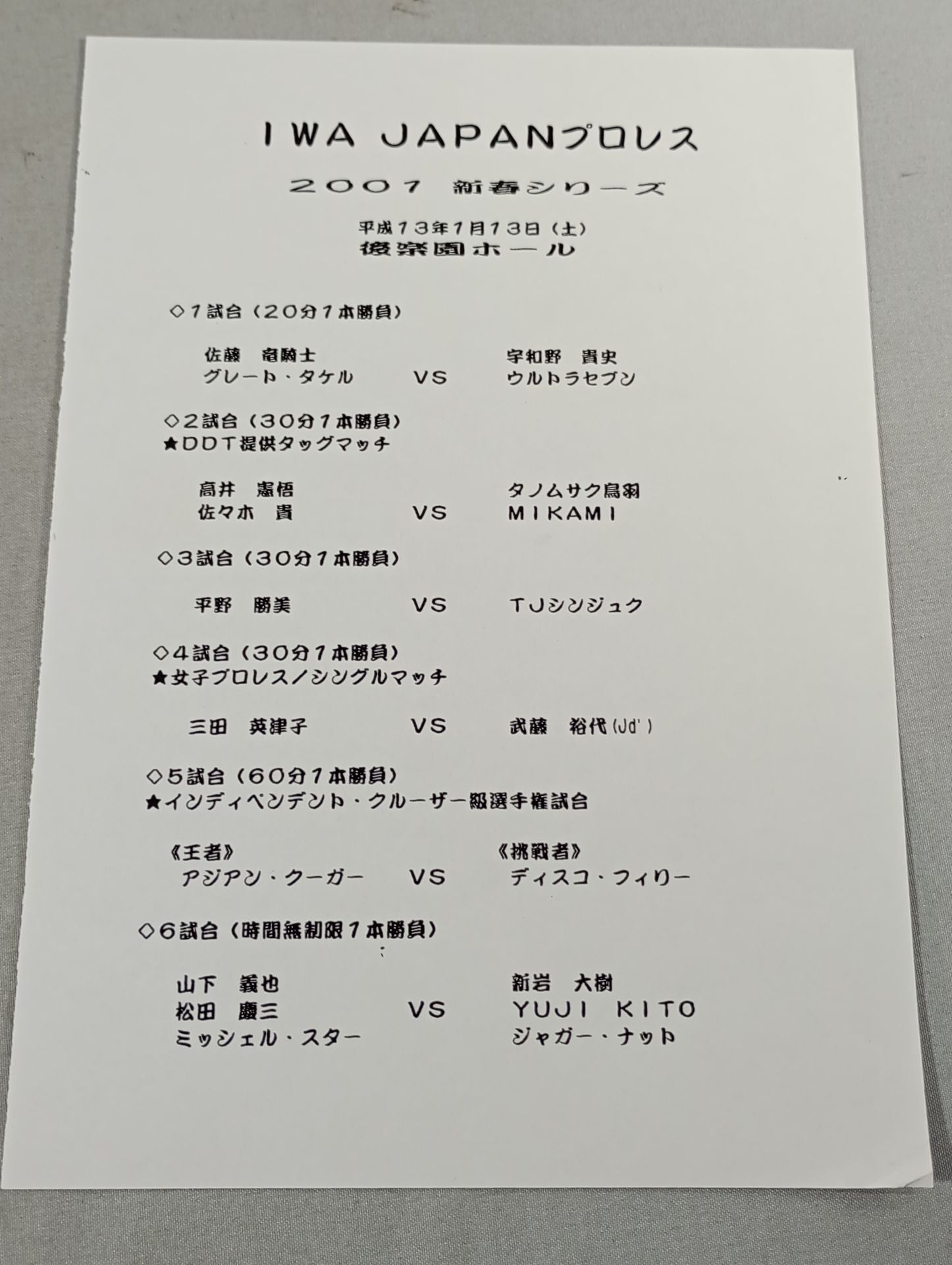 2001 Venue: Korakuen Hall / stamped with list of matches: Yoshiya Yamashita & Keizo Matsuda & Michelle Starr vs Daiki Shiniwa & YUJI KITO & Jaguar Nut 2001 New Year Series