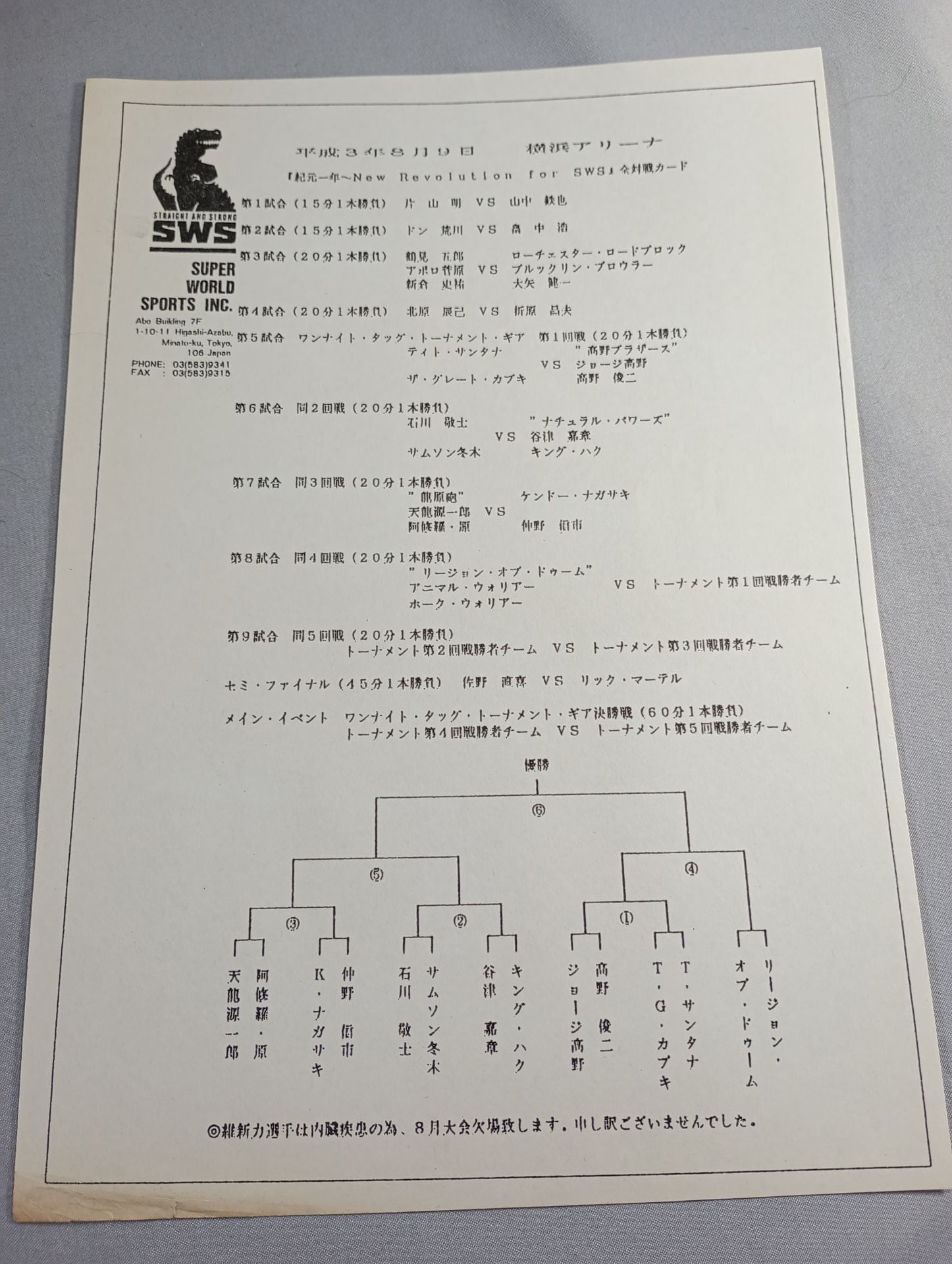 1991 Venue: Yokohama Arena / List of the matches on the separate sheet available: 【 One Night Tag Team Tournament Gear Finals] 4th Round Winner vs 5th Round Winner (Tenryu Genichiro & Ashura Hara vsLegion of Doom (Road Warriors)