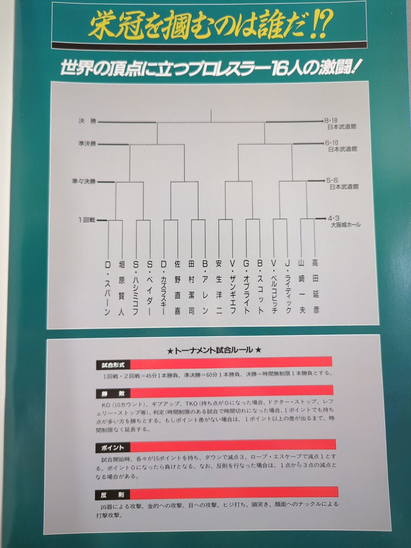 1994 Venue: Osaka-jo Hall / List of the matches is printed : Nobuhiko Takada vs Kazuo Yamazaki / Gary Albrightvs Billy Scott / Super Vader vs Salman Hashmikov / Dan Svern vs Kento Kakihara / Viktor Zangiev vs Yoji Anjo 94 PRO-Wrestling WORLD TOURNAMENT