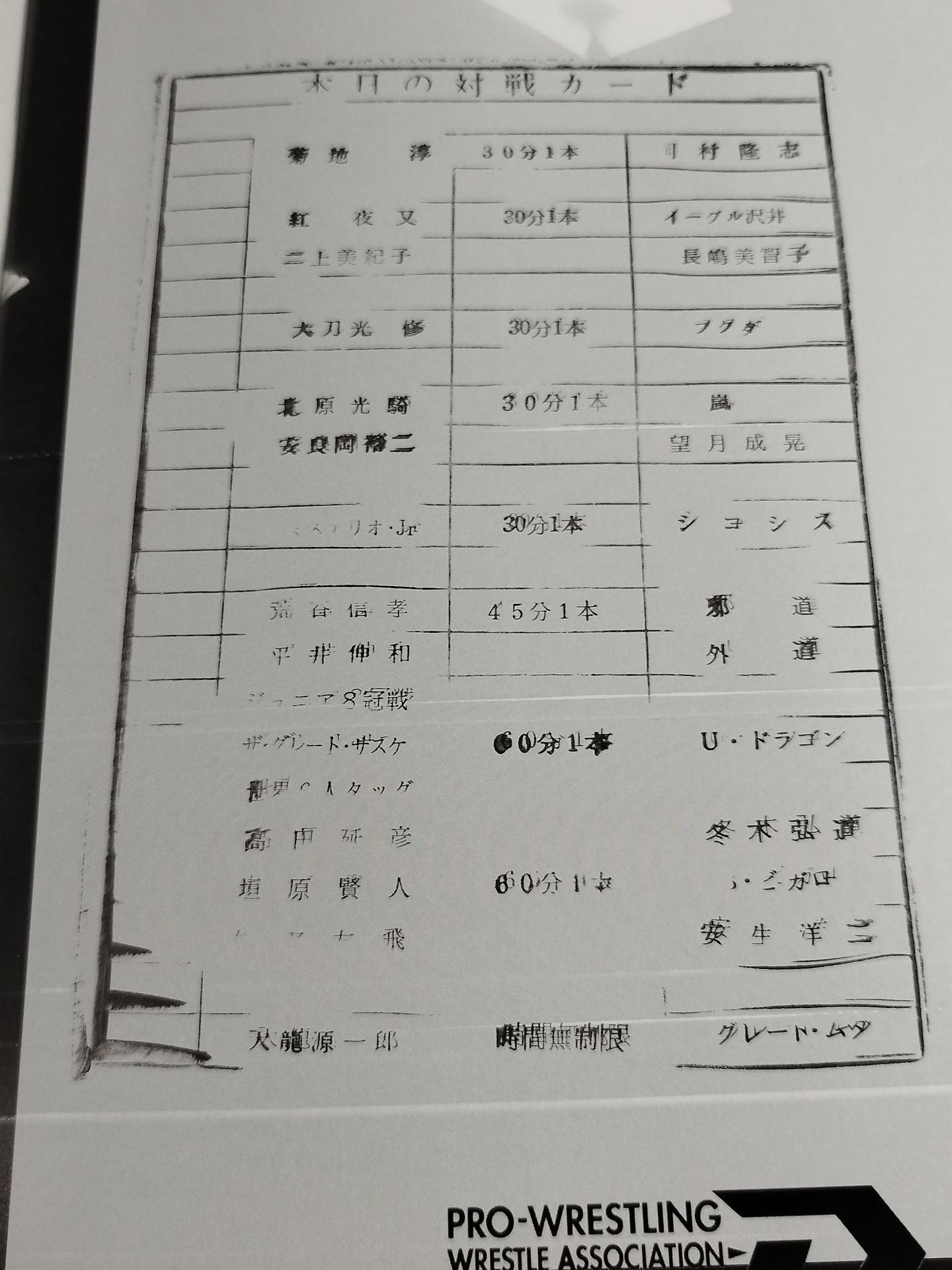 1996 Venue: Osaka Prefectural Gymnasium / stamped with list of matches : TenryuGenichiro vs Great Muta / [WAR Certified 6-Man Tag Team Fighters Rights Match] Nobuhiko Takada & Kento Kakihara & Tomohi Sano vs Kodo Fuyuki & Crusher Bambang Bigaro & Yoji Anjo