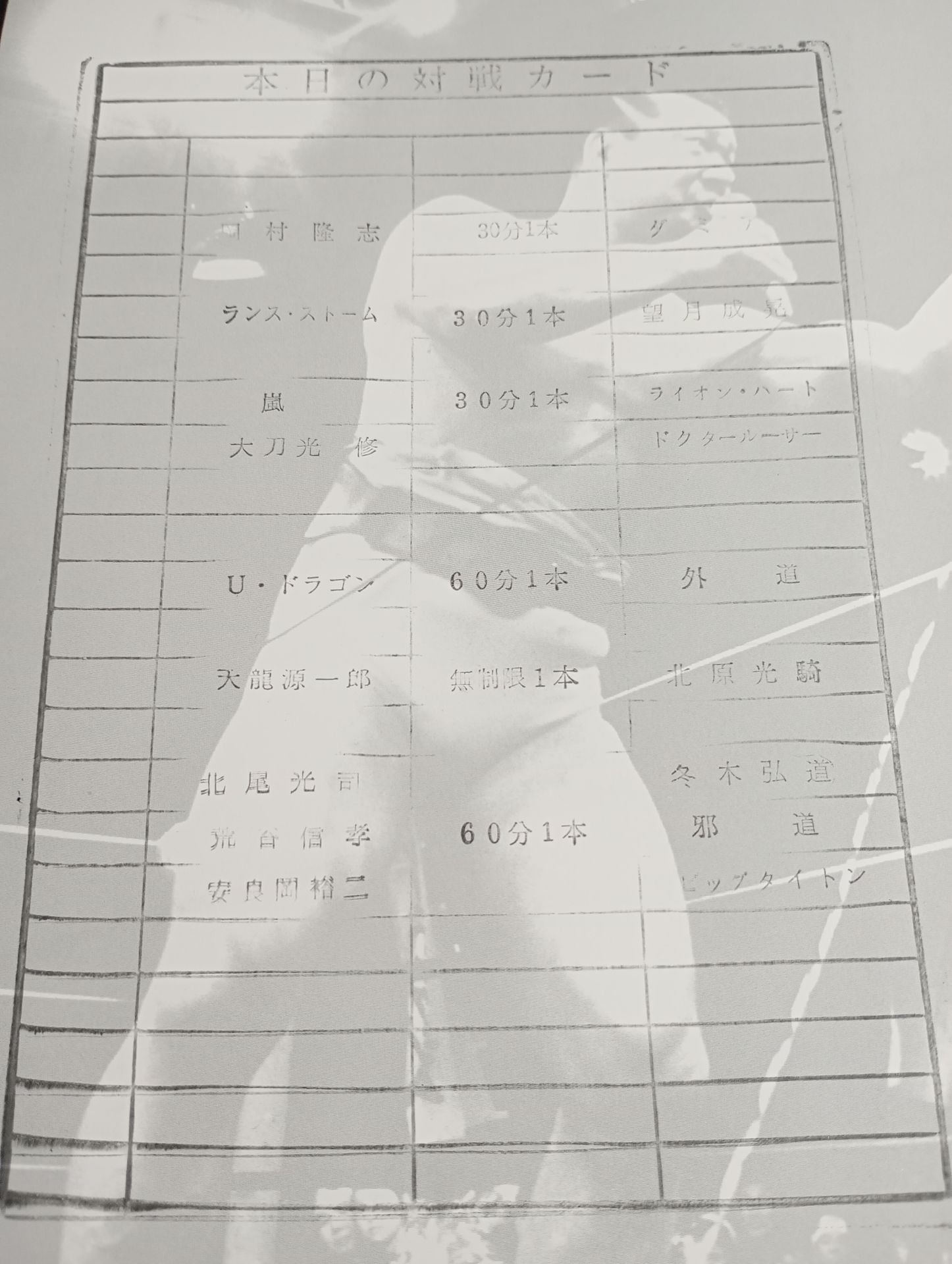 1996 Stamped with List of Matches : Koji Kitao & Nobutaka Aratani & Yuji Yasuraoka vsKodo Fuyuki & Jado & GEDO