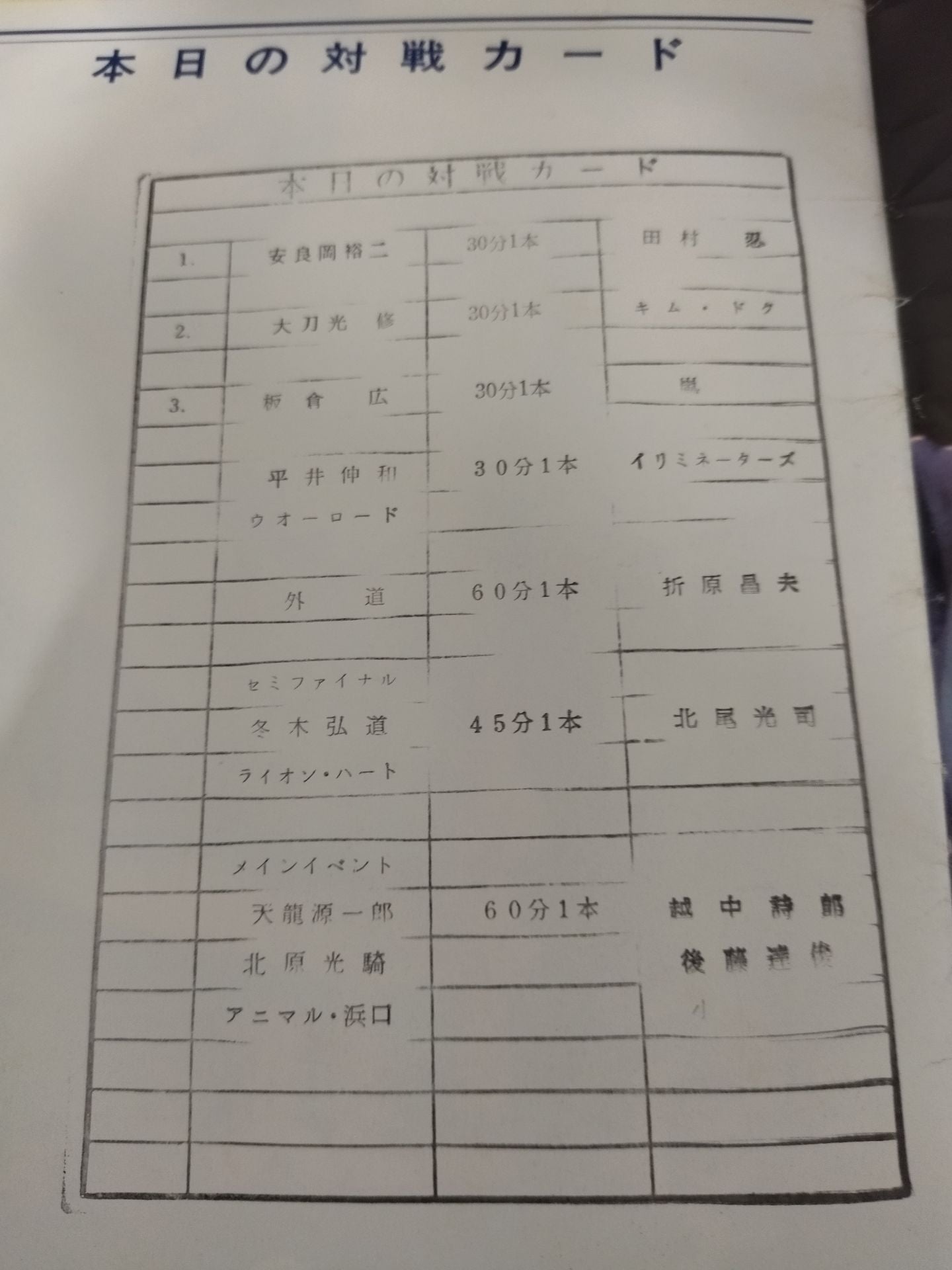 1995 Venue: Korakuen Hall (Final Round) / stamped with list of matches : [WAR Certified World 6-Man Tag Team Fighters Rights Match] TenryuGenichiro & Koki Kitahara & Animal Hamaguchi vsShiro Koshinaka & Tatsutoshi Goto & Michiyoshi Ohara