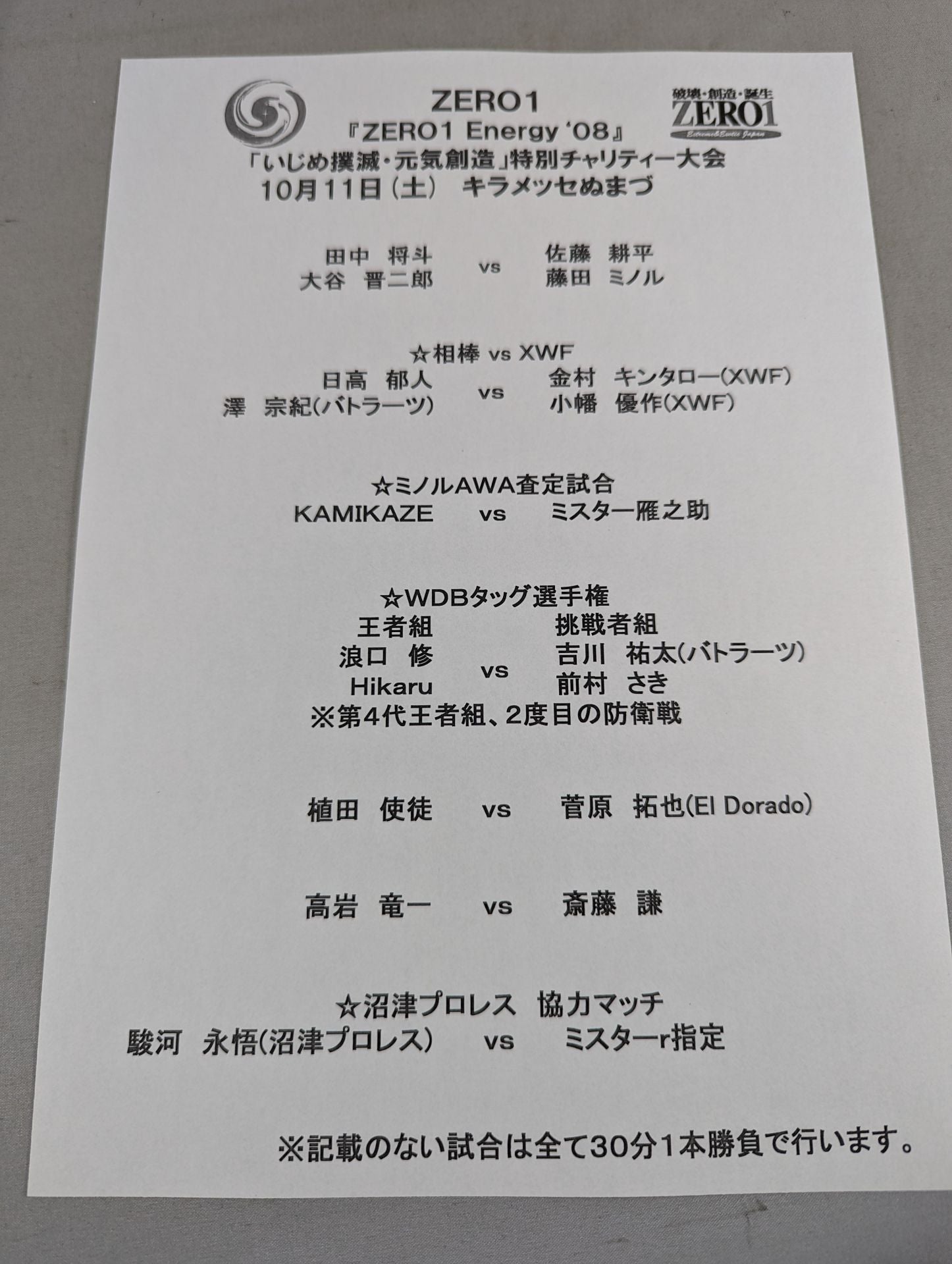 2008 Venue: Shizuoka Kiramesse Numazu / List of the matches on the separate sheetYes: Masato Tanaka & Shinjiro Otani vs Kohei Sato & Minoru Fujita ZERO1 Energy '08 / " Bullying Eradication and Energetic Creation" Nationwide Development Project Special Charity Tournament