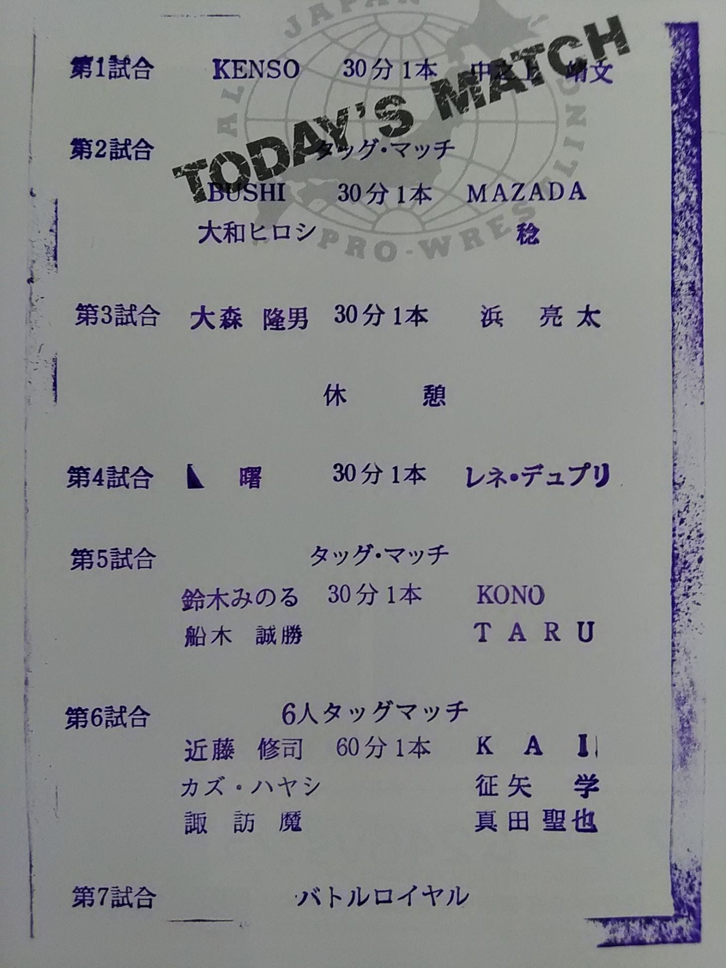 2011 KENSO, KAI More than 2 fighters hand signed autograph !! Stamped with list of matches : [Battle Royale] / SUWAMA & Kazu Hayashi & Shuji Kondo vs Seiya Sanada & Manabu Soya & KAI