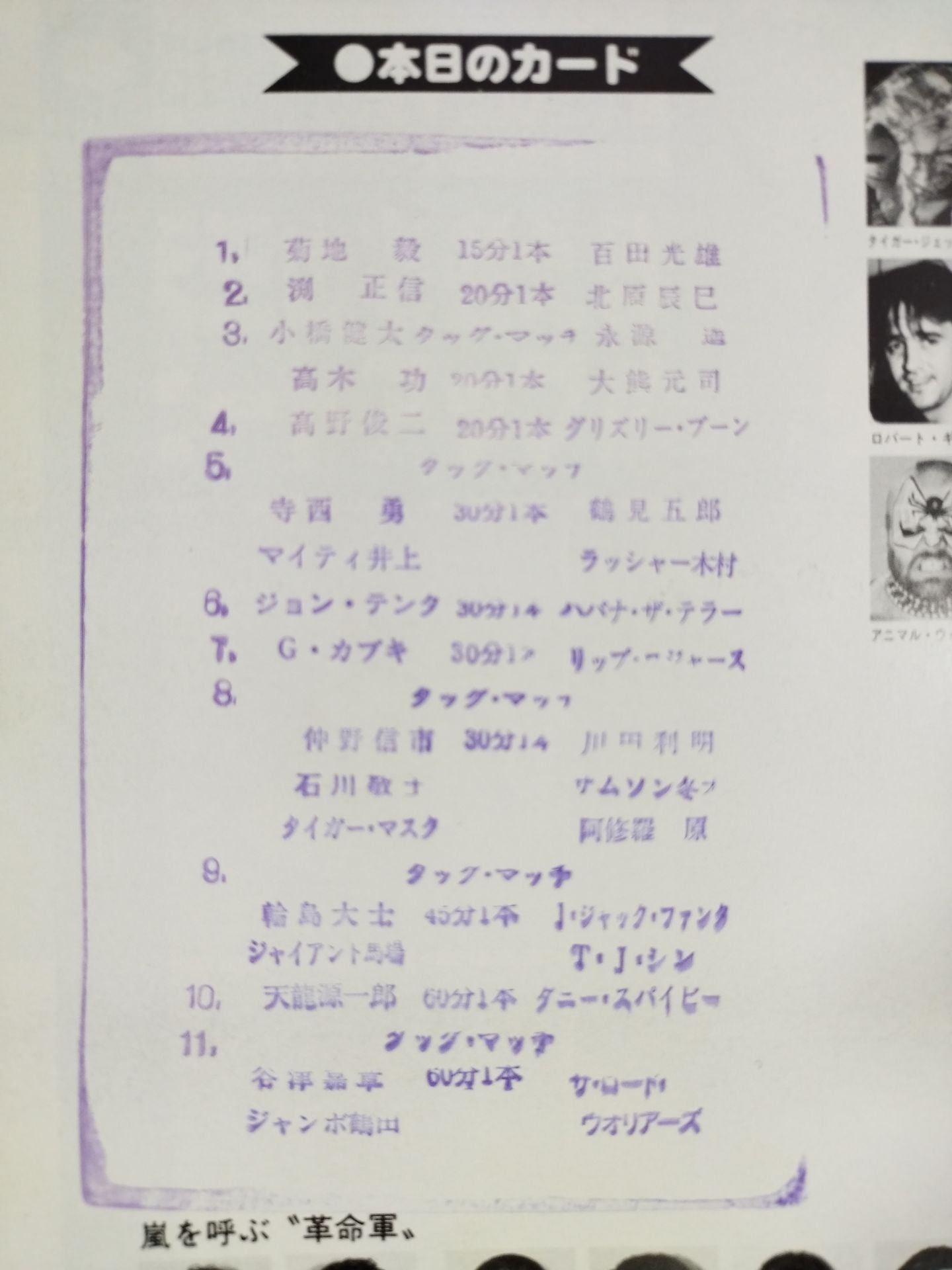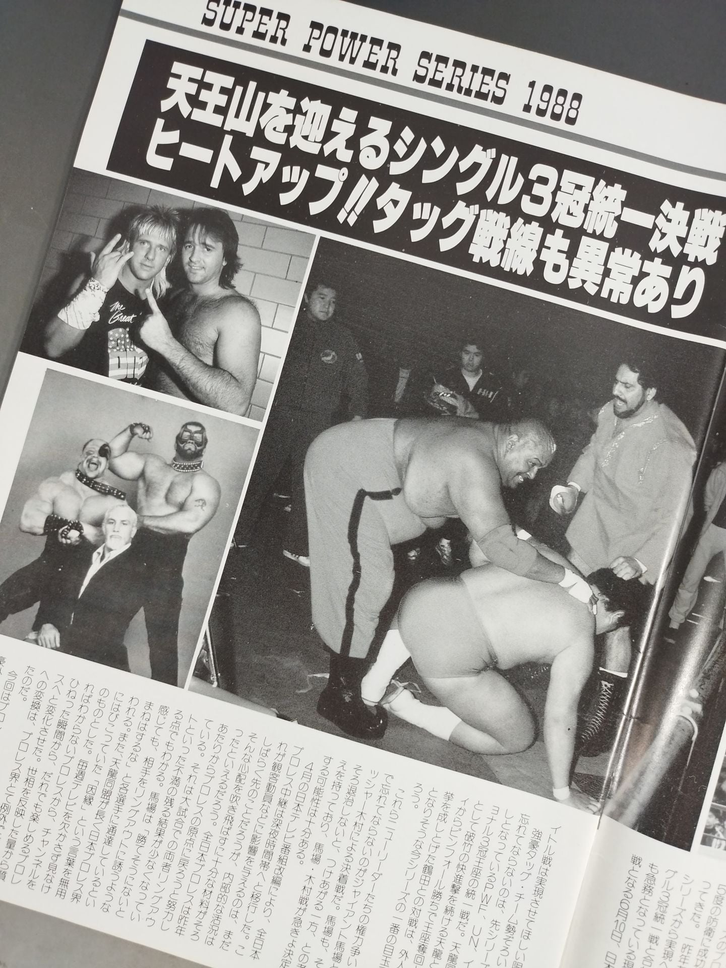 1988 Venue: Japan Budokan / stamped with list of matches : International Tag Team & PWF World Tag TeamFighters Rights Match] Jumbo Tsuruta & Yoshiaki Yatsu vs The Road Warriors * After the tournament, the Olympic duo who won the unification match was recognized as the first World Tag Team Champion. / [UN Heavyweight fighters Rights Match] Tenryu Genichiro vsDan Spivey (Danny Spivey)