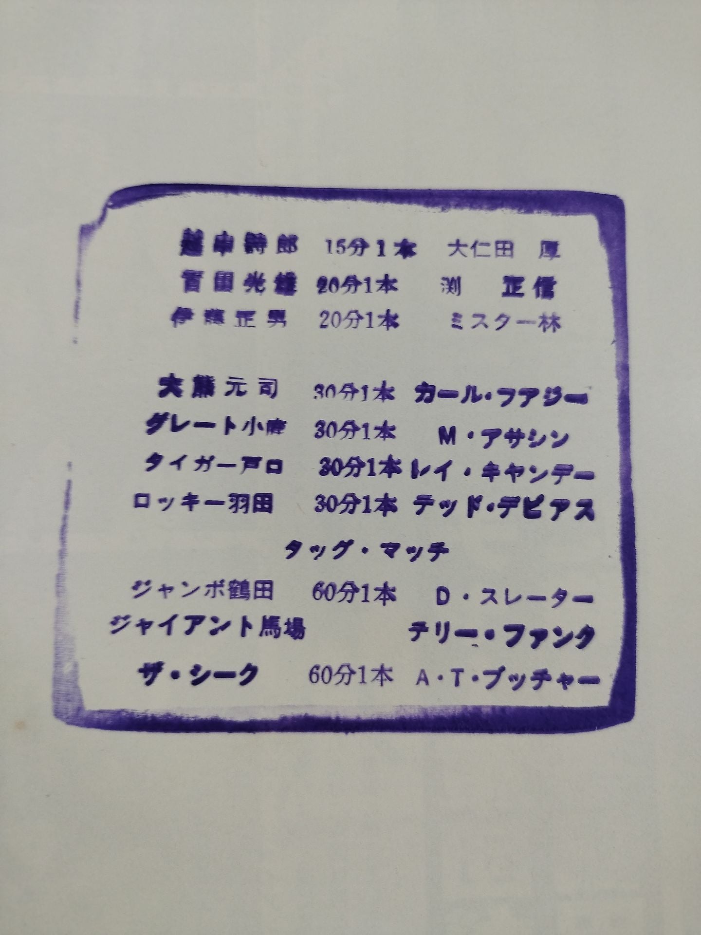 1980 Venue: Korakuen Hall / stamped with list of matches :The Sheikvs Abdullah the Butcher * During the match, the sheik attacks the play-by-play announcer Kuramochi and bleeds heavily! Suffer a serious injury that requires 15 stitches!