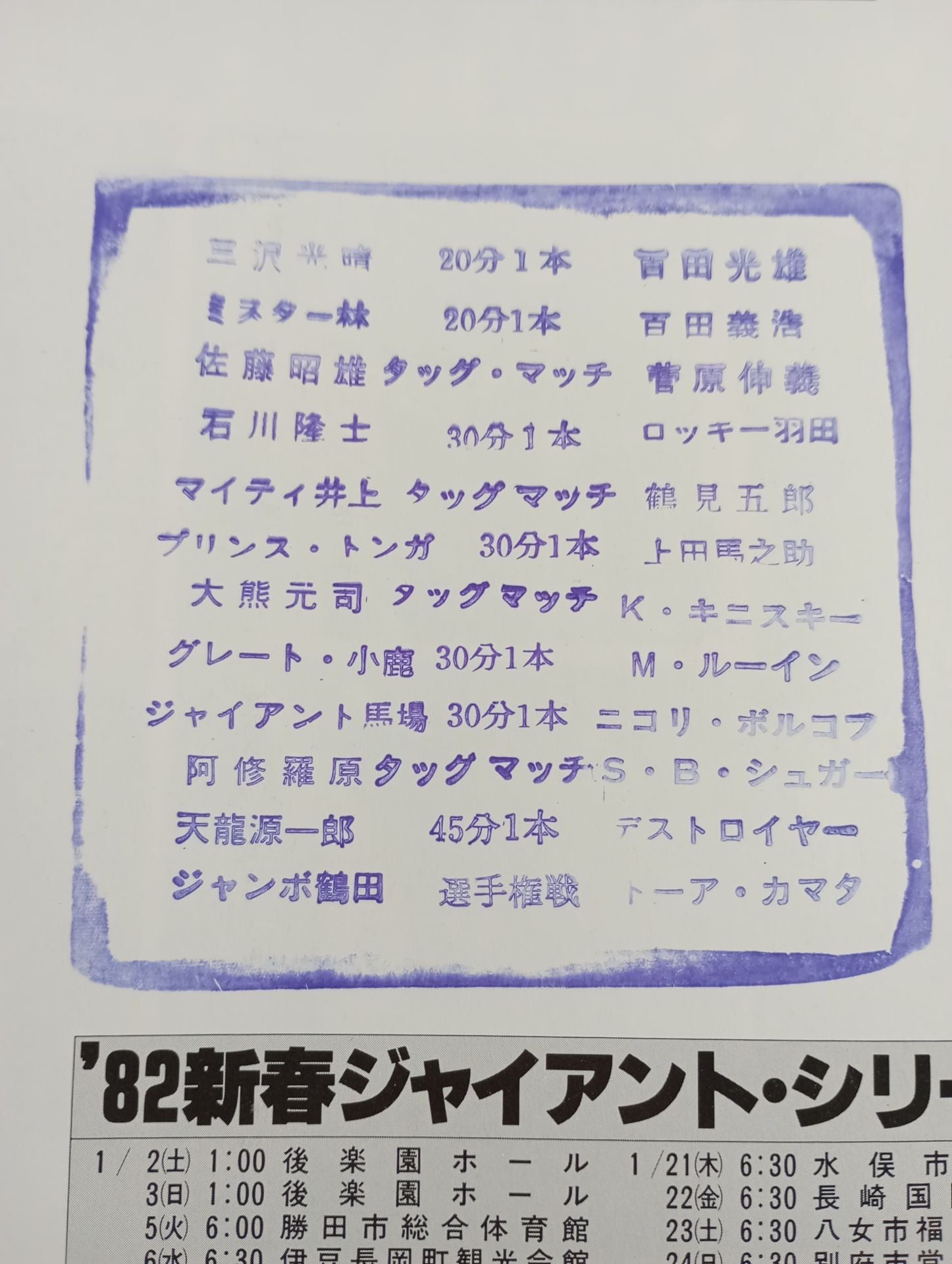 1982 Venue: Korakuen Hall / stamped with list of matches : UN Heavyweight Fighters Rights MatchJumbo Tsuruta vs Killer Tor Kamata