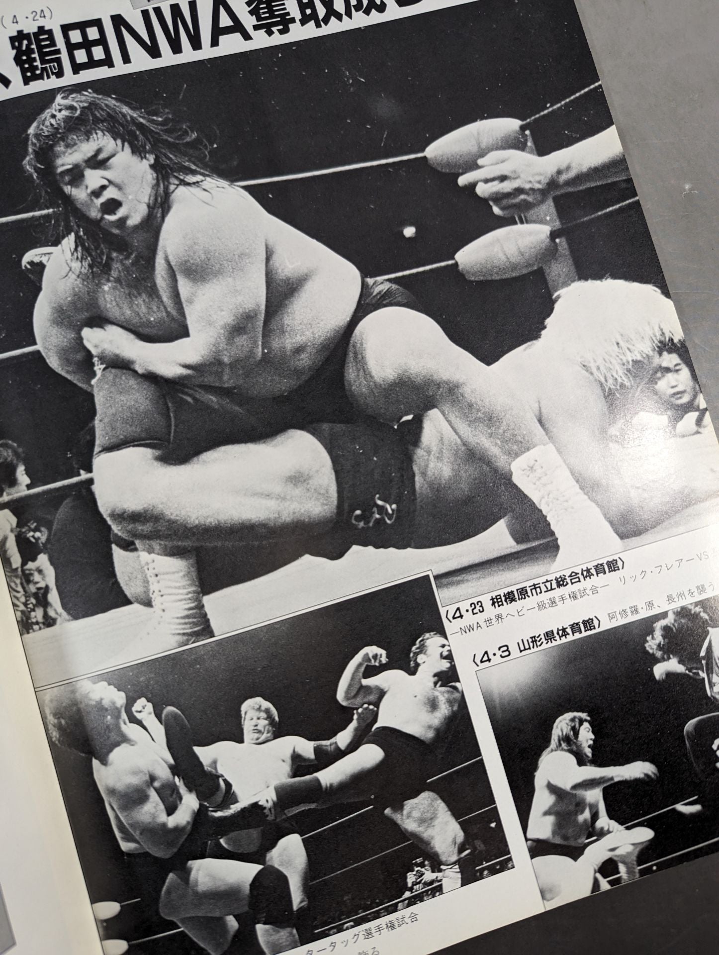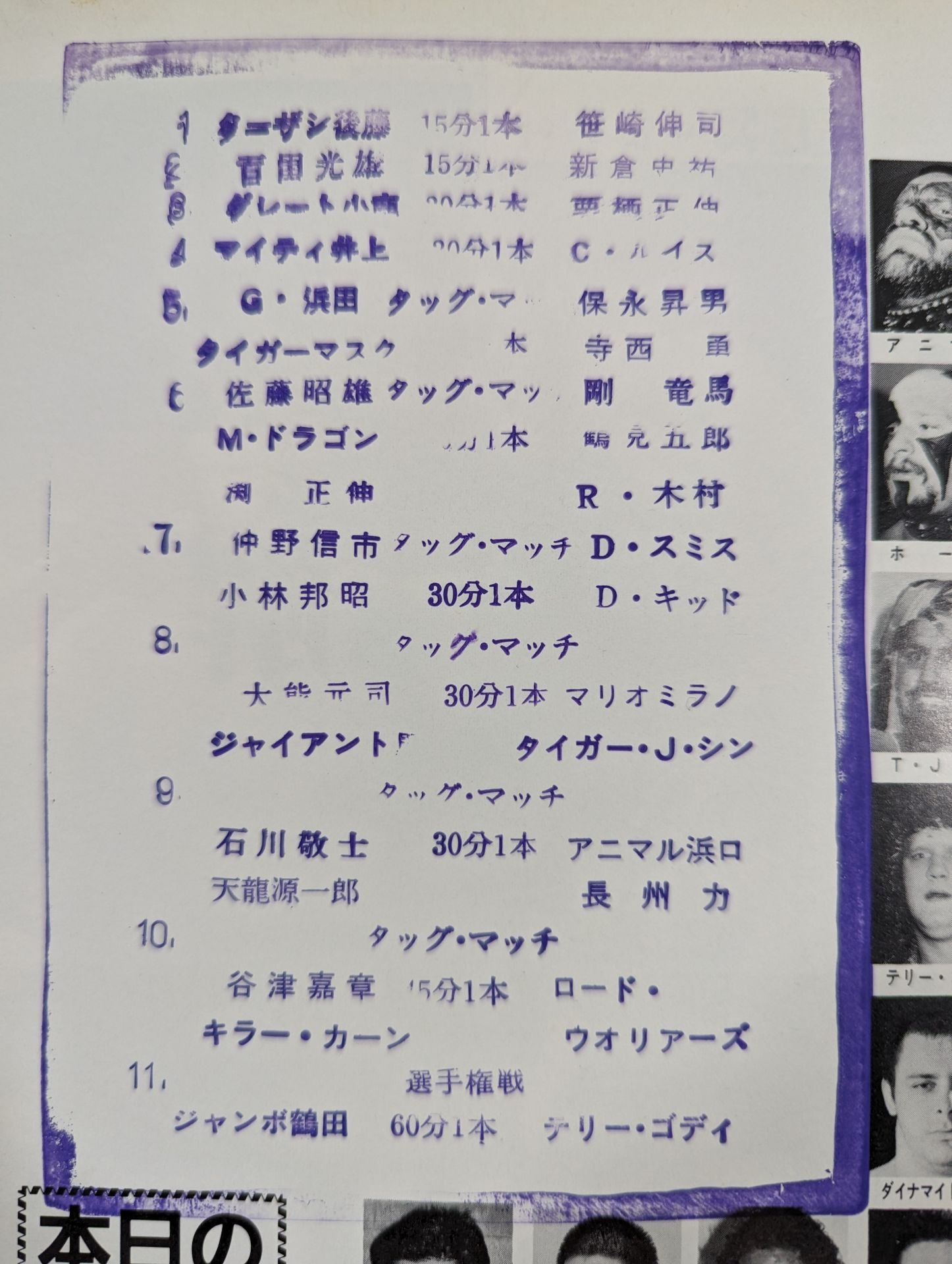 Venue: Osaka Castle Hall / stamped with list of matches : [Inter fighters match] Jumbo Tsuruta vs Terry Gordy / Yoshiaki Yatsu & Killer Khan vs The Road Warriors