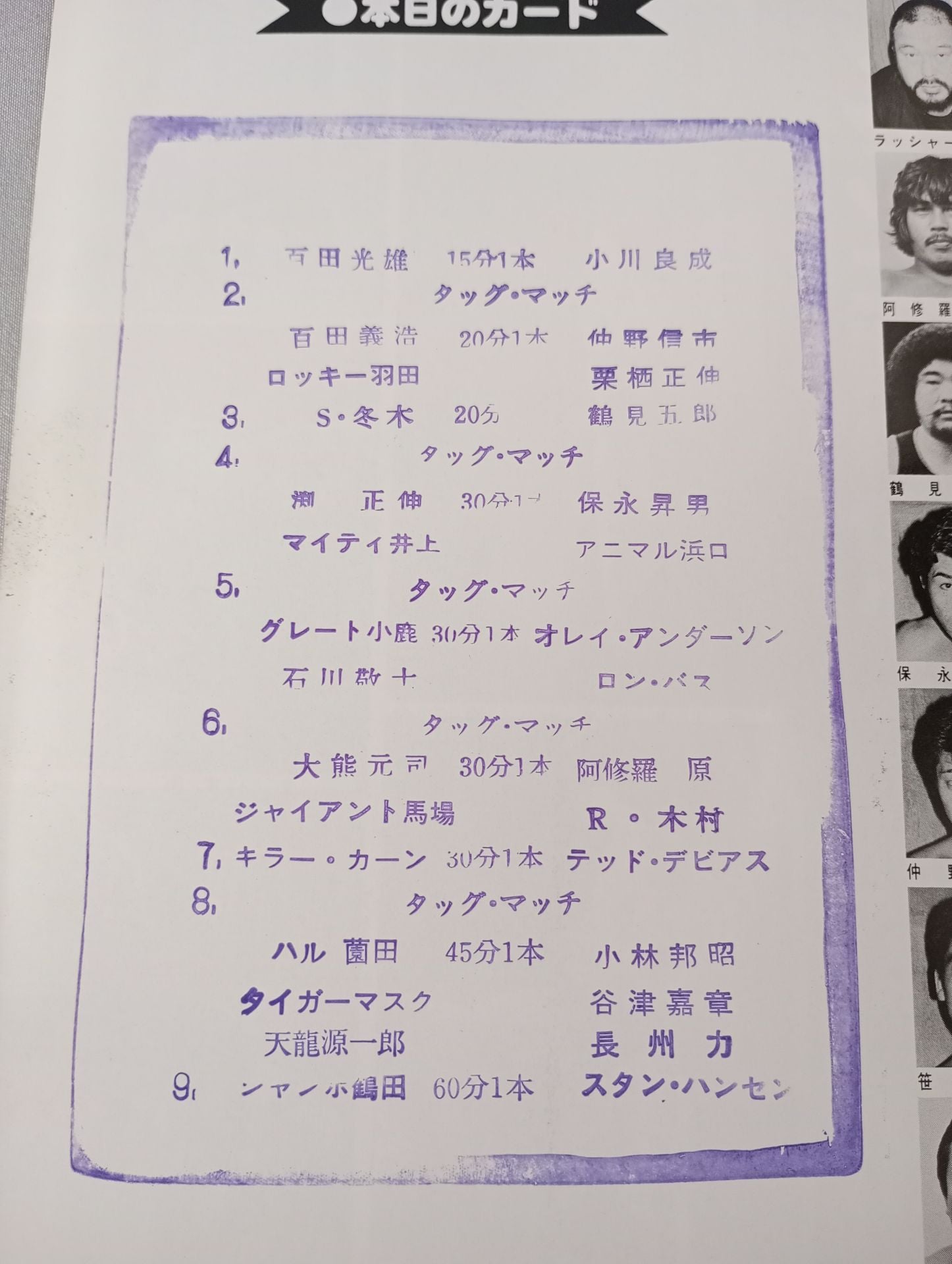 1986 Venue: Korakuen Hall (season opener) / stamped with list of matches: [AWA World Heavyweight & PWF Heavyweight & Inter Heavyweight fighters ] Jumbo Tsuruta vs Stan Hansen / TenryuGenichiro & Tiger Mask & Haru Sonoda vs Riki Choshu & Yoshiaki Yatsu & Kuniaki Kobayashi