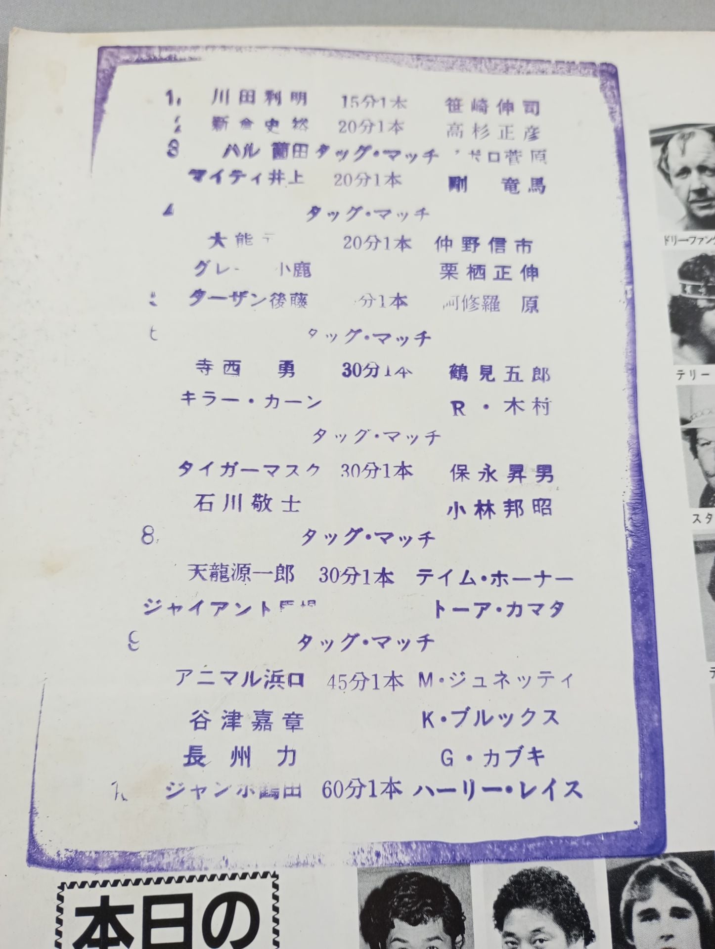 1985 Venue: Korakuen Hall / Stamped with list of matches : [Inter-heavyweight fighters rights match] Jumbo Tsuruta vs Harley Race / Riki Choshu & Yoshiaki Yatsu & Animal Hamaguchi vs Great Kabuki & Killer Brooks & Marty Giunetti