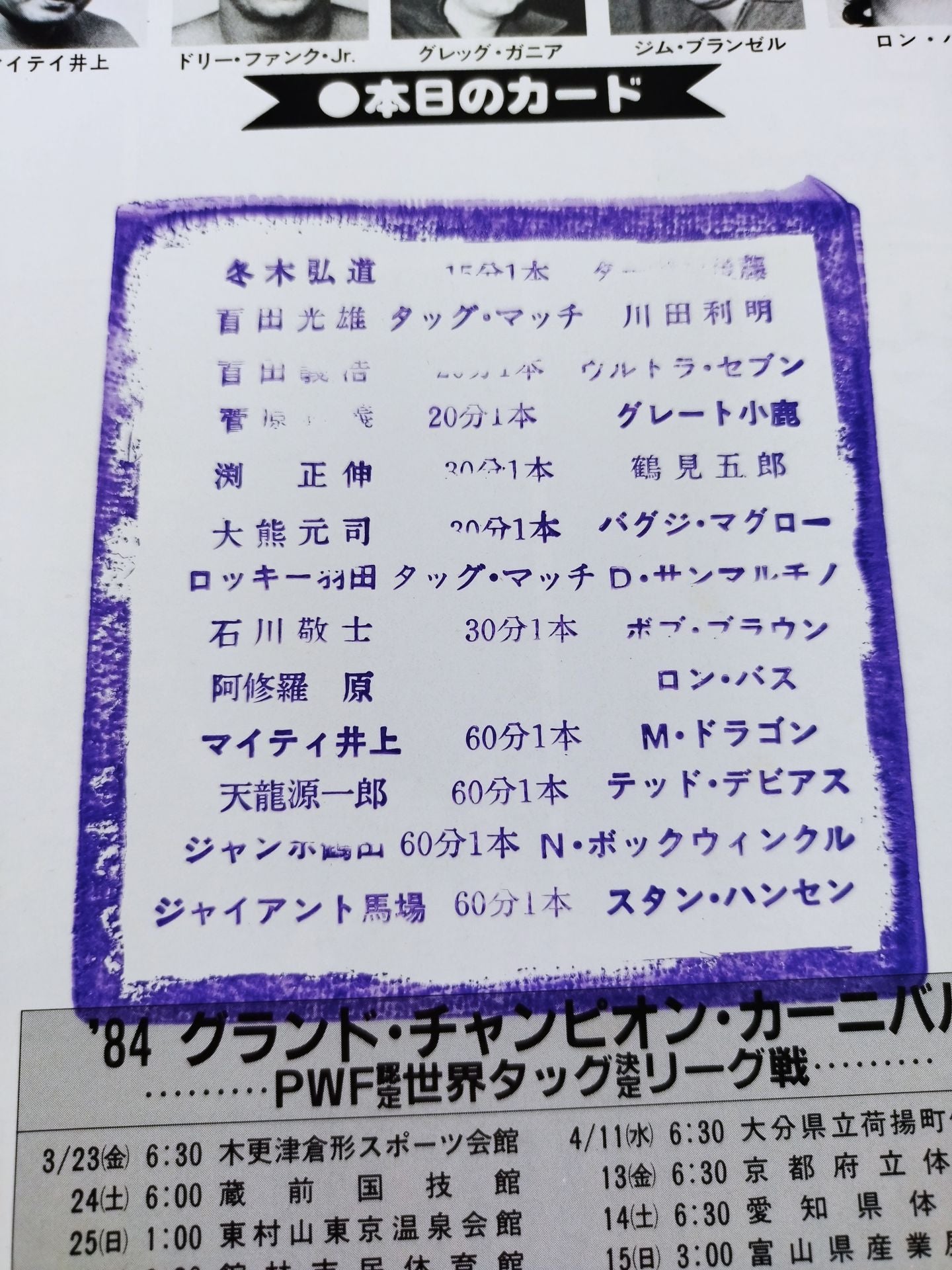 1984 Venue: Kuramae Kokugikan / stamped with list of matches : [PWF Heavyweight Fighters Rights Match] Giant Babavs Stan Hansen / [AWA World Heavyweight Fighters Rights Match] Jumbo Tsuruta vs Nick Bockwinkel / [UN Heavyweightfighters Match] Tenryu Genichiro vsTed DiBiase / PWF World Tag Team Title Match