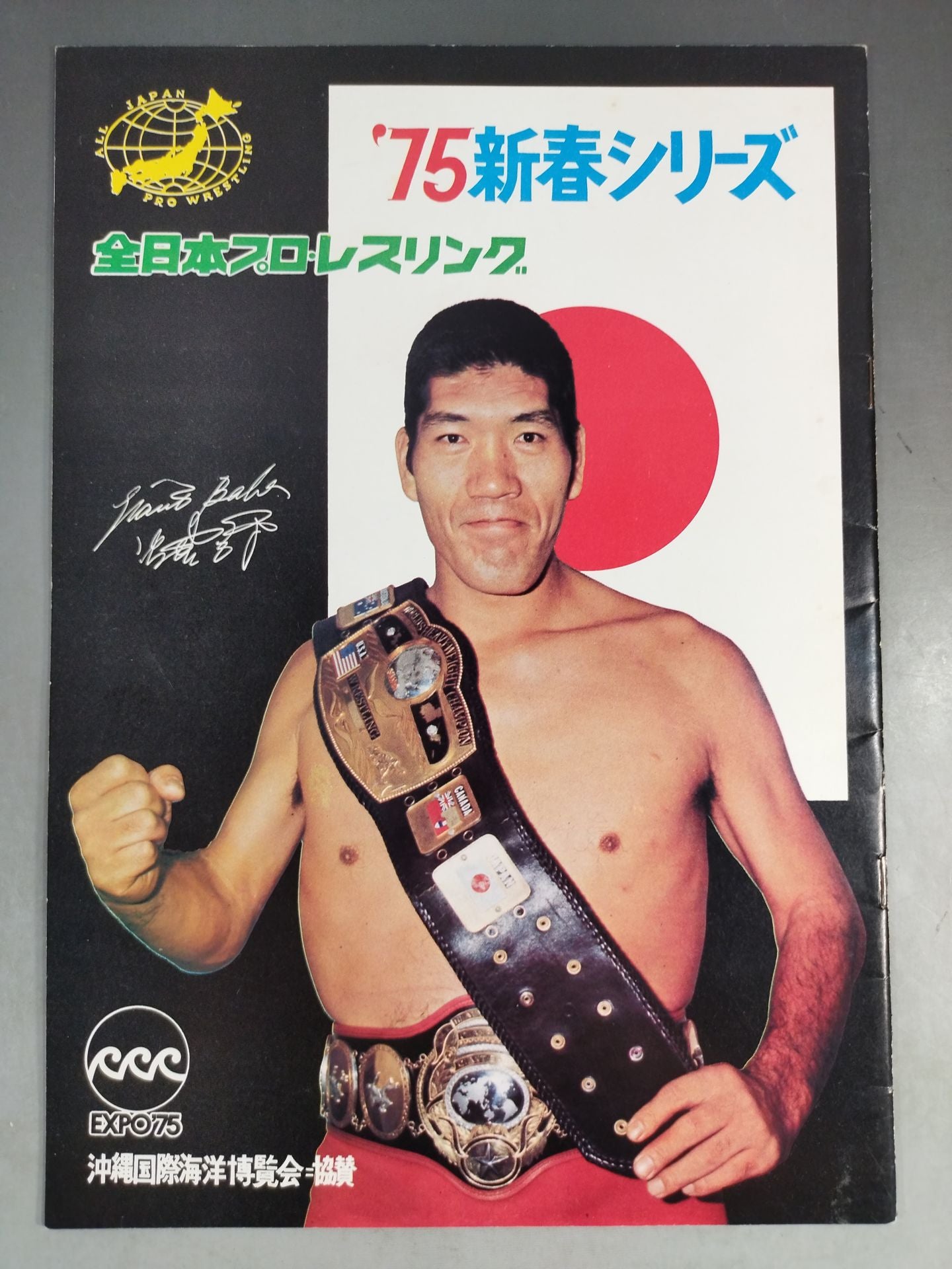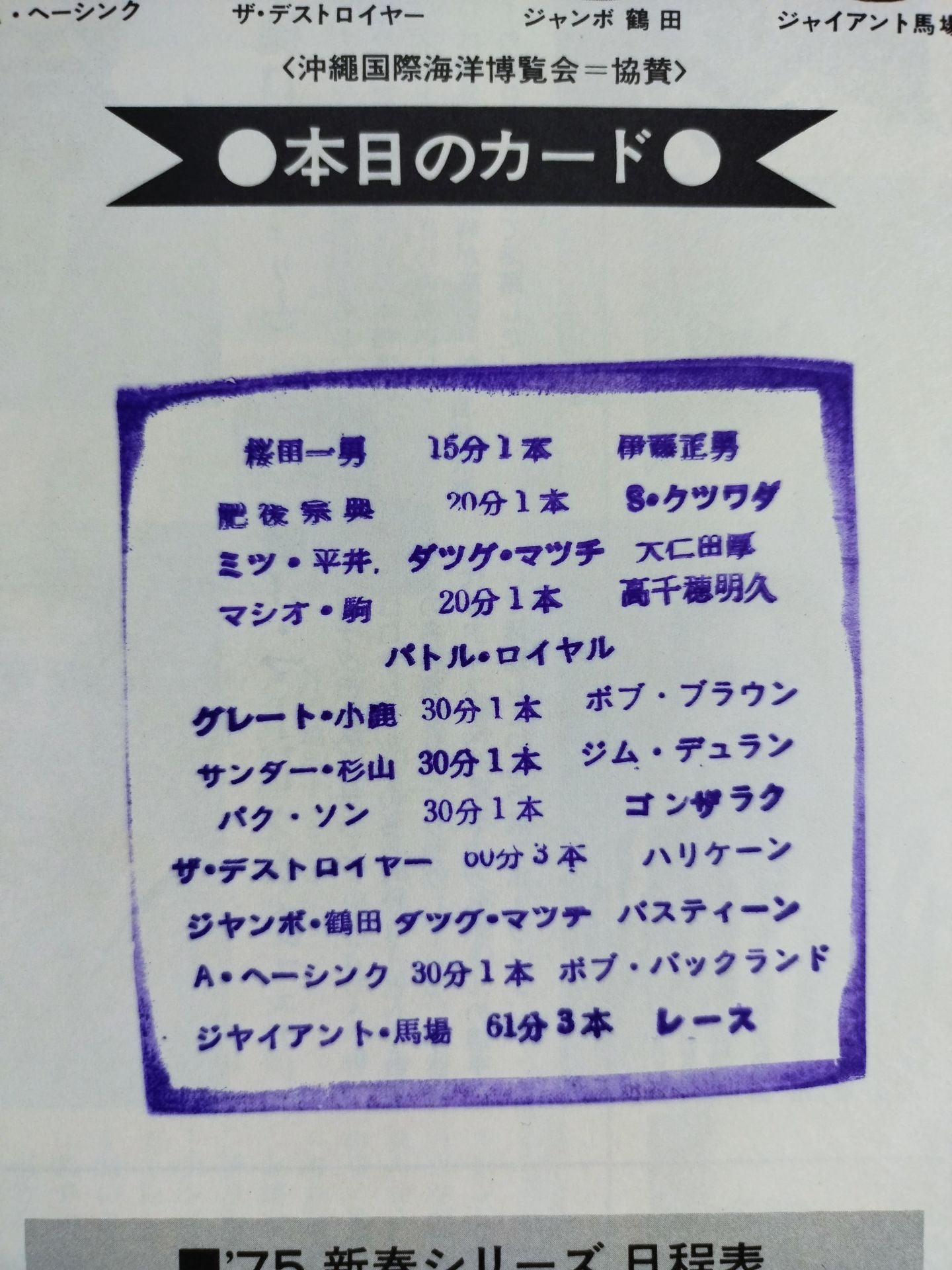 1975 Venue: Tokyo Gymnasium (Final Match) / stamped with list of matches : [PWF HeavyweightFighters Rights Match] Giant Baba vs Harley Race / [US Heavyweight Fighters ] The Destroyer vs Calypse Hurricane